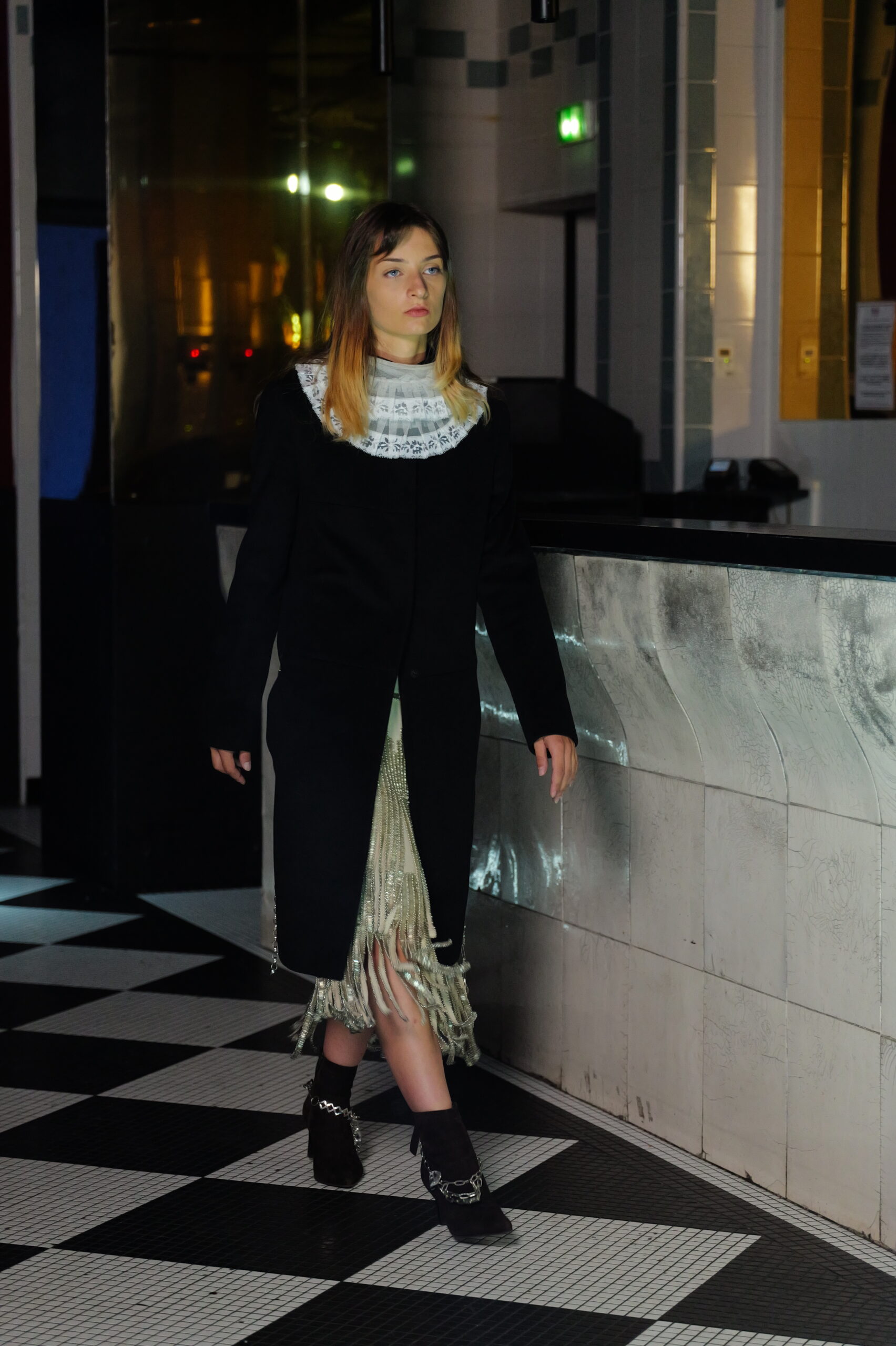A necklace woven from lace and metal cords drapes across the body like an artifact, while Boris’ sculpted hair, recalling a Donatello statue with punk undertones, pushes the narrative further into modern myth.