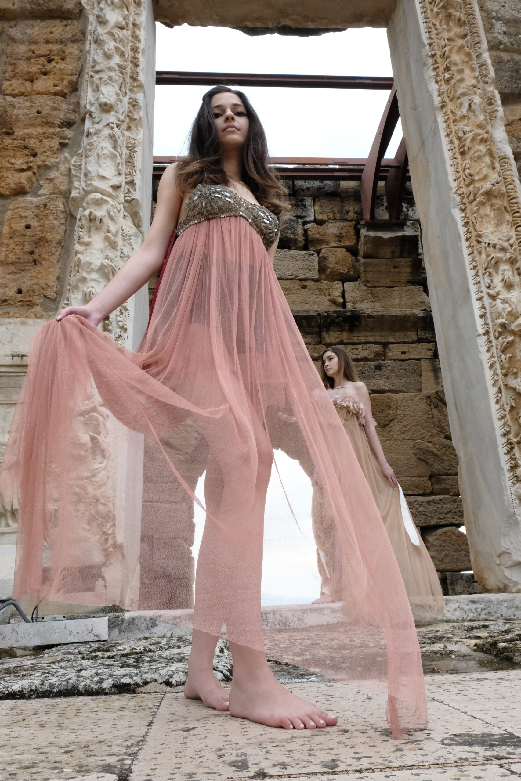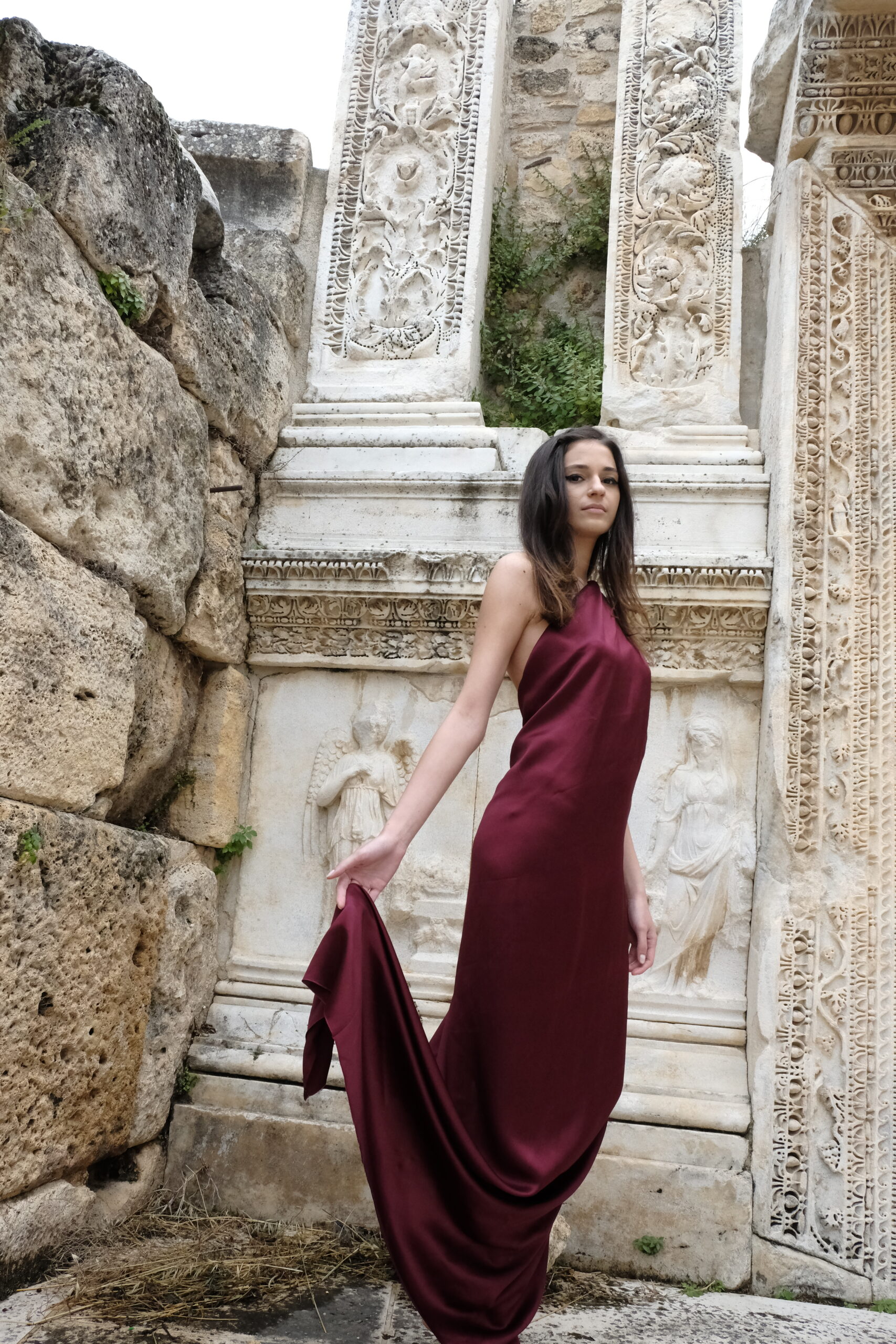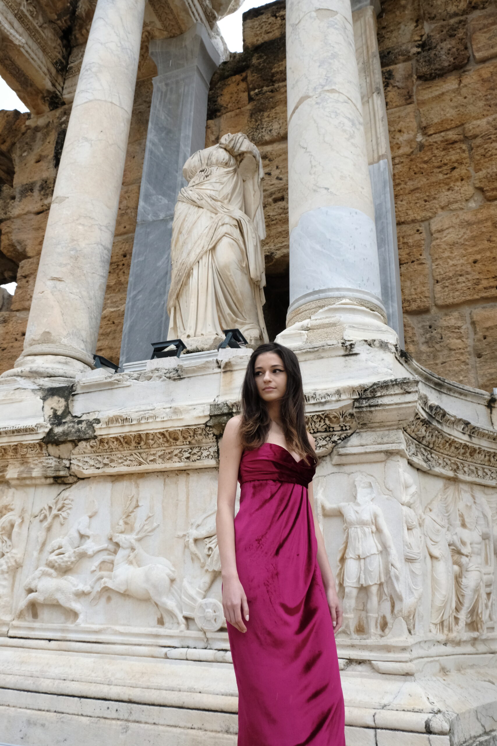 The journey began in Turkey, where Sofia visited Hierapolis, the sacred Mediterranean city layered with myths from the pre-Hellenic to Roman eras. Among marble bas-reliefs and weathered theater stones, she imagined purple-red curtains and drapes moving through the ancient air. That vision translated into fabrics sculpted with volume and movement — double satin, translucent tulle, and velvets that carry the weight of history yet feel alive in the present.