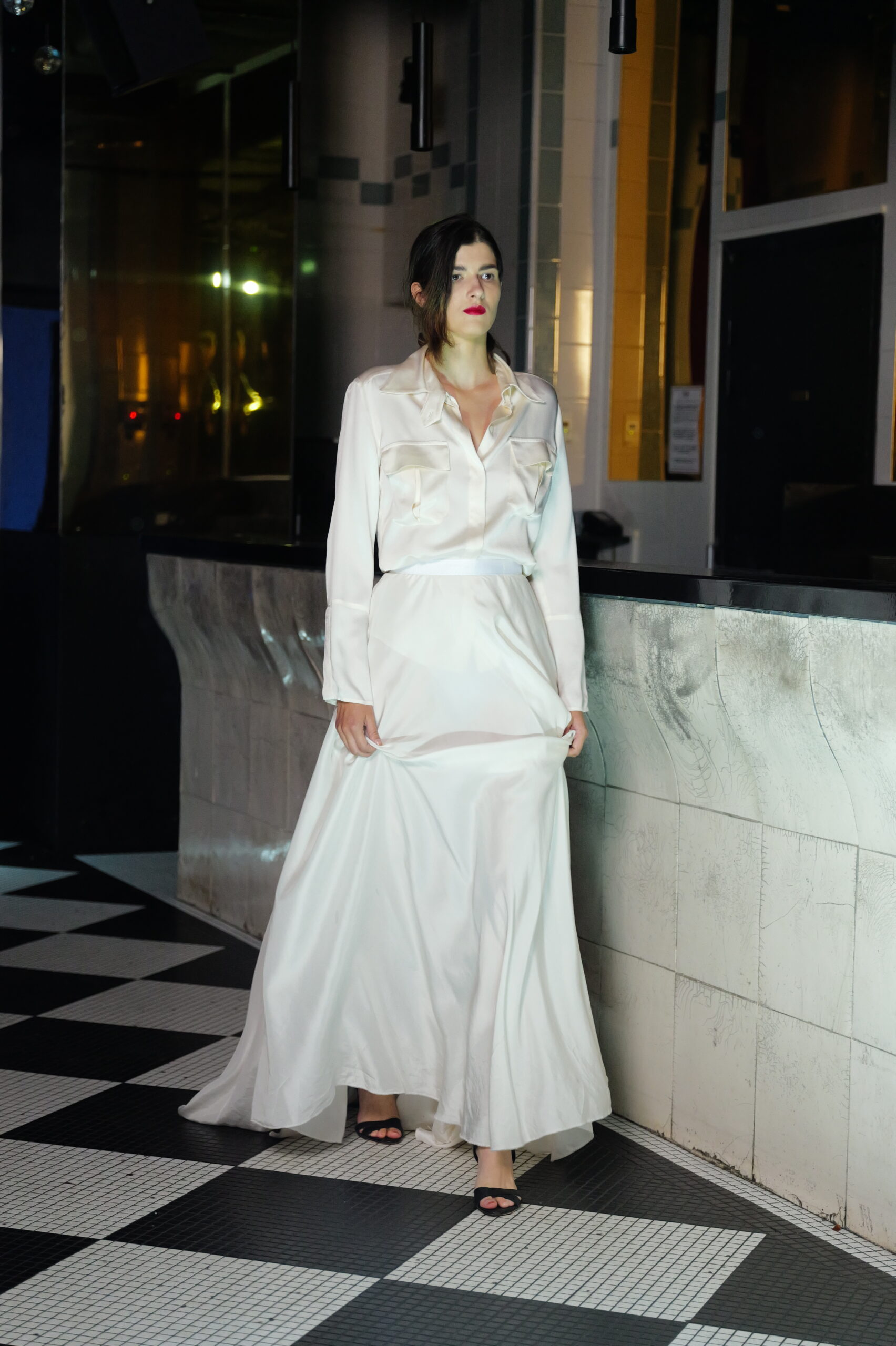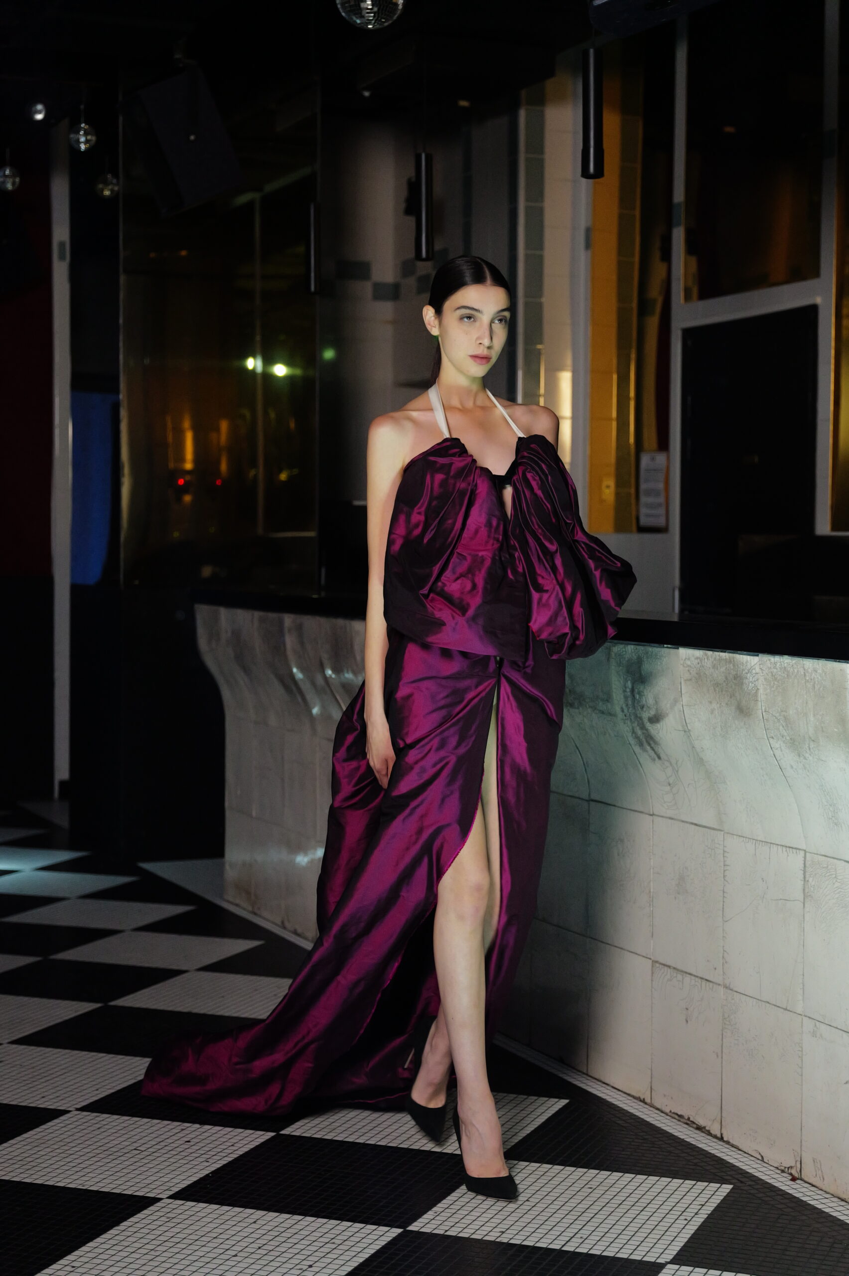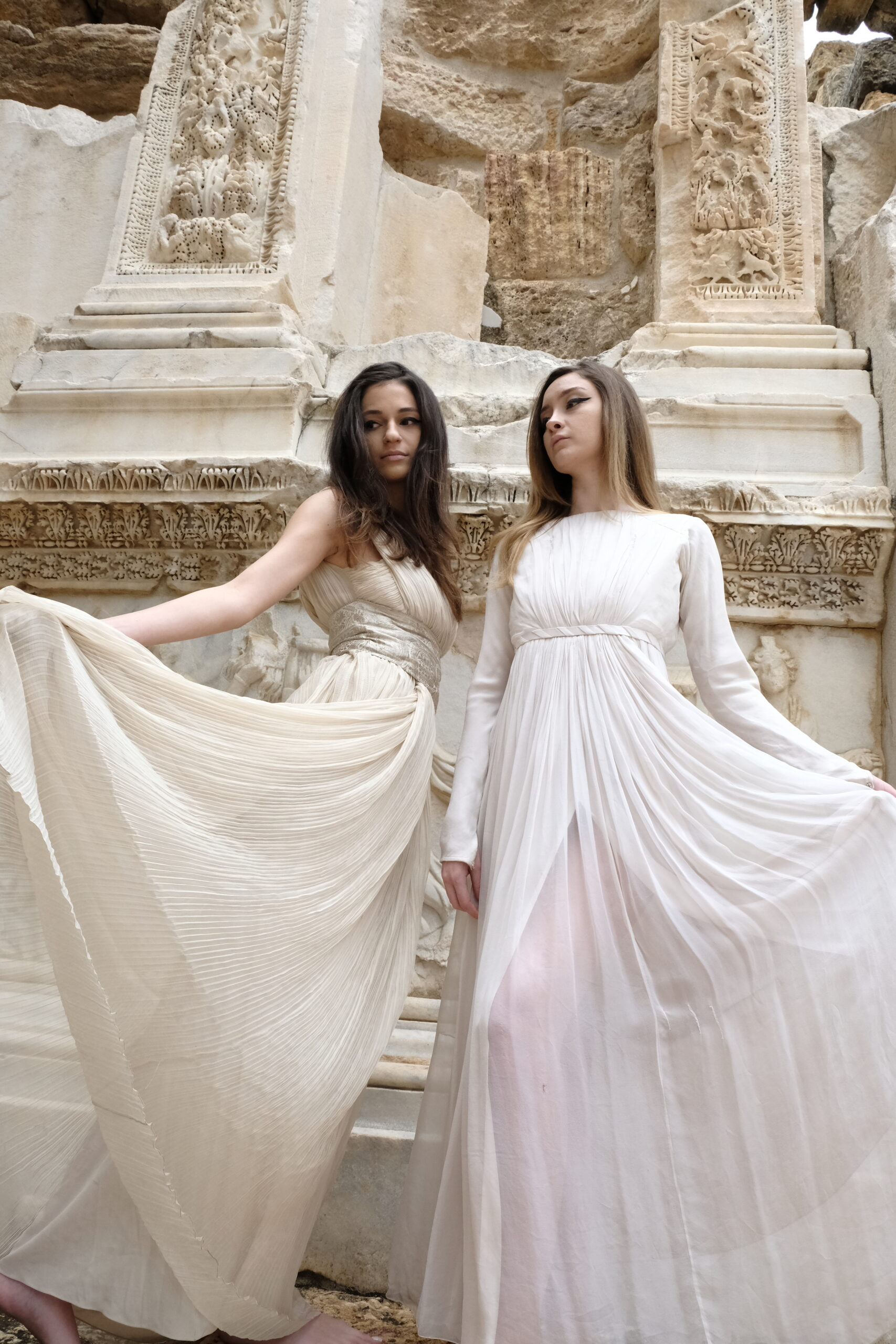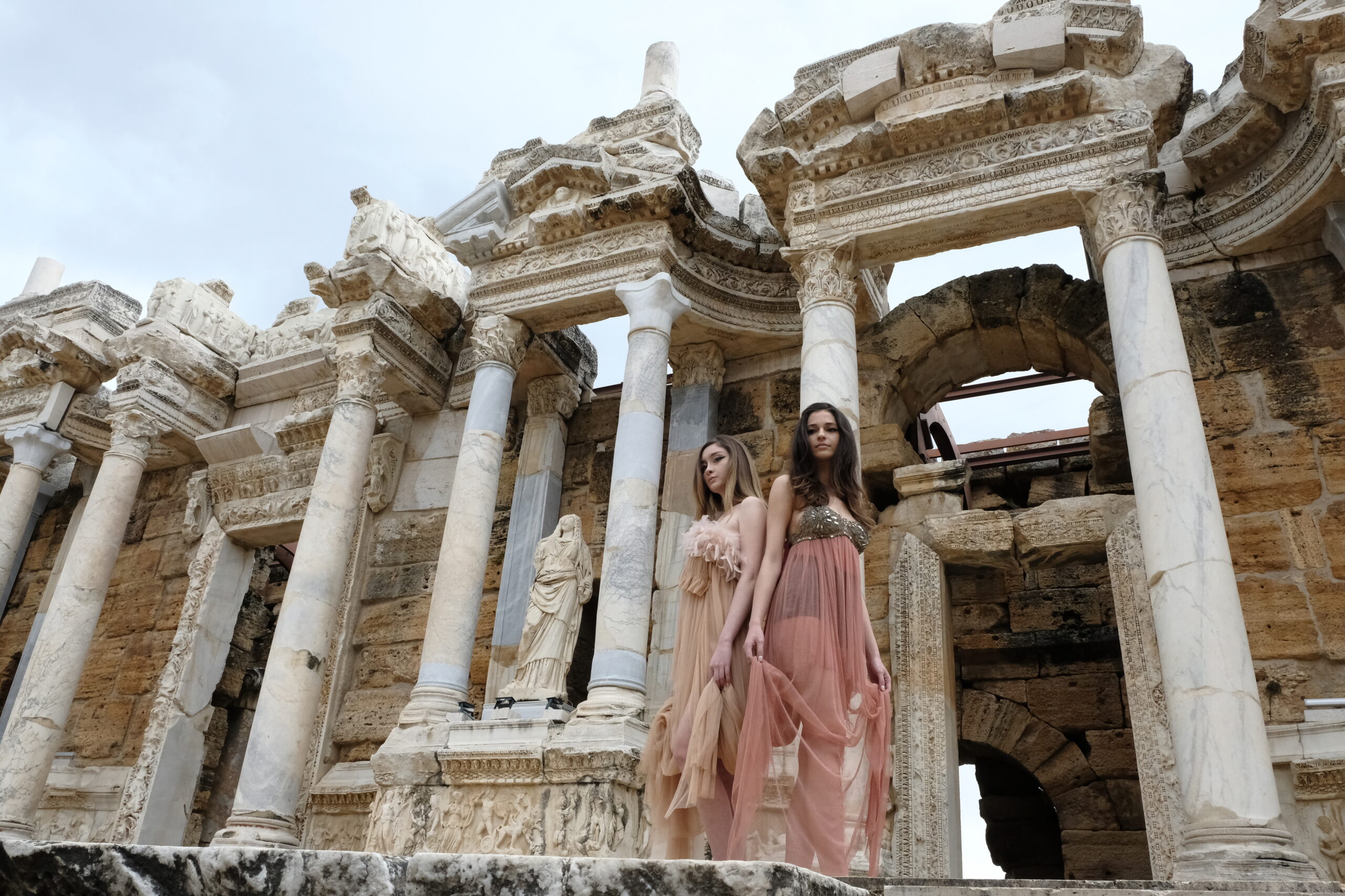 The journey began in Turkey, where Sofia visited Hierapolis, the sacred Mediterranean city layered with myths from the pre-Hellenic to Roman eras. Among marble bas-reliefs and weathered theater stones, she imagined purple-red curtains and drapes moving through the ancient air. That vision translated into fabrics sculpted with volume and movement — double satin, translucent tulle, and velvets that carry the weight of history yet feel alive in the present.