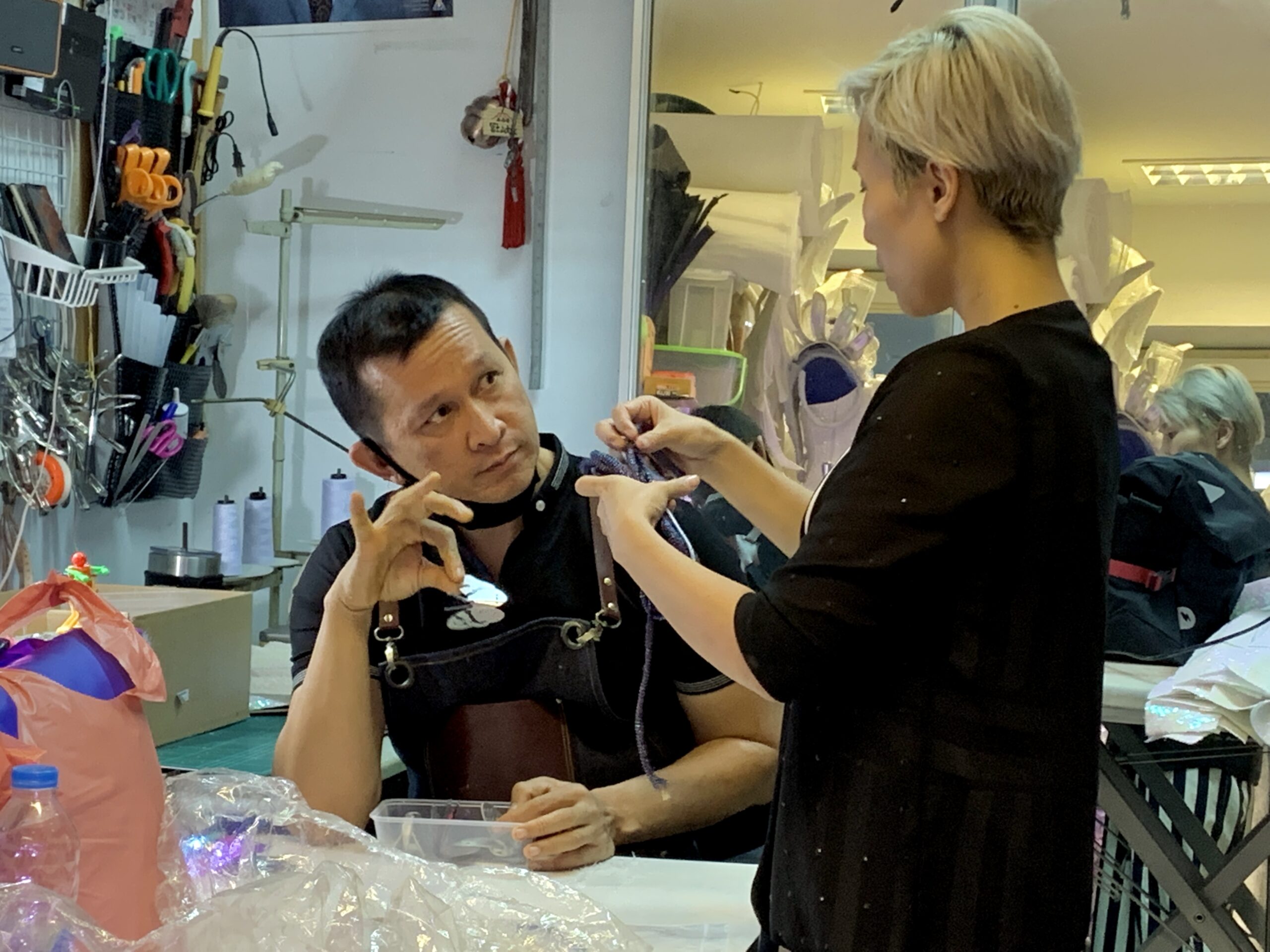 Another original one is my cork outfit. Cork material has been used in interior design. It’s a remix of what I have learned in interior design. I see this material has also been used for bags, which is an accessory. Also, because I have to heavily produce a lot of costumes, I know the principles of the material. Here is again my German thinking.