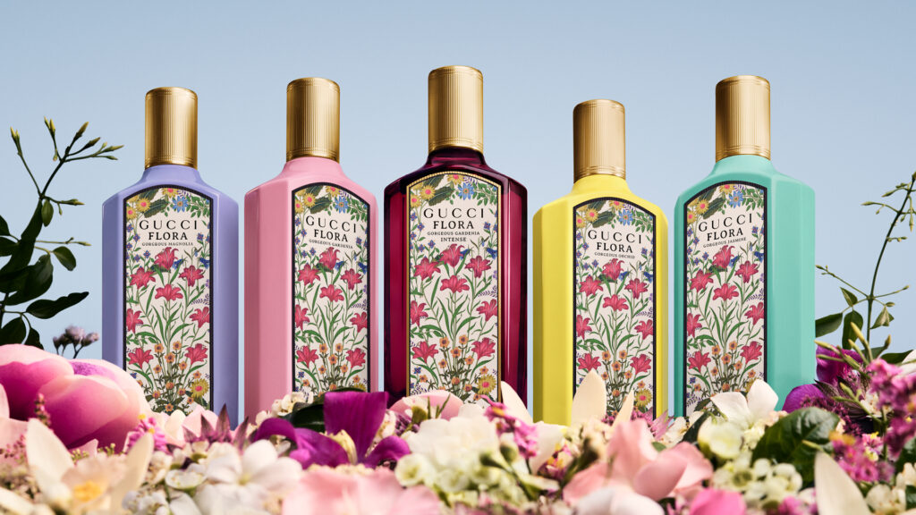 Housed in a fuchsia glass bottle adorned with Gucci’s iconic Flora motif, the perfume feels as much like an accessory as a fragrance. Designed by Vittorio Accornero de Testa in 1966, the intricate floral pattern is now a Gucci signature. A new gold “Intense” inscription glints under the light, reflecting the richness within.