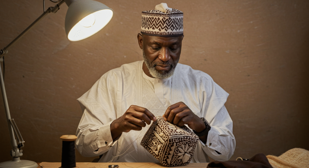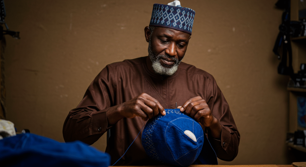 “People often ask why it’s so expensive,” says Umaru Bello, a third-generation capmaker from Katsina. “But if you watch someone sit for 8 hours a day stitching with a single needle and a steady hand, you won’t ask again.”