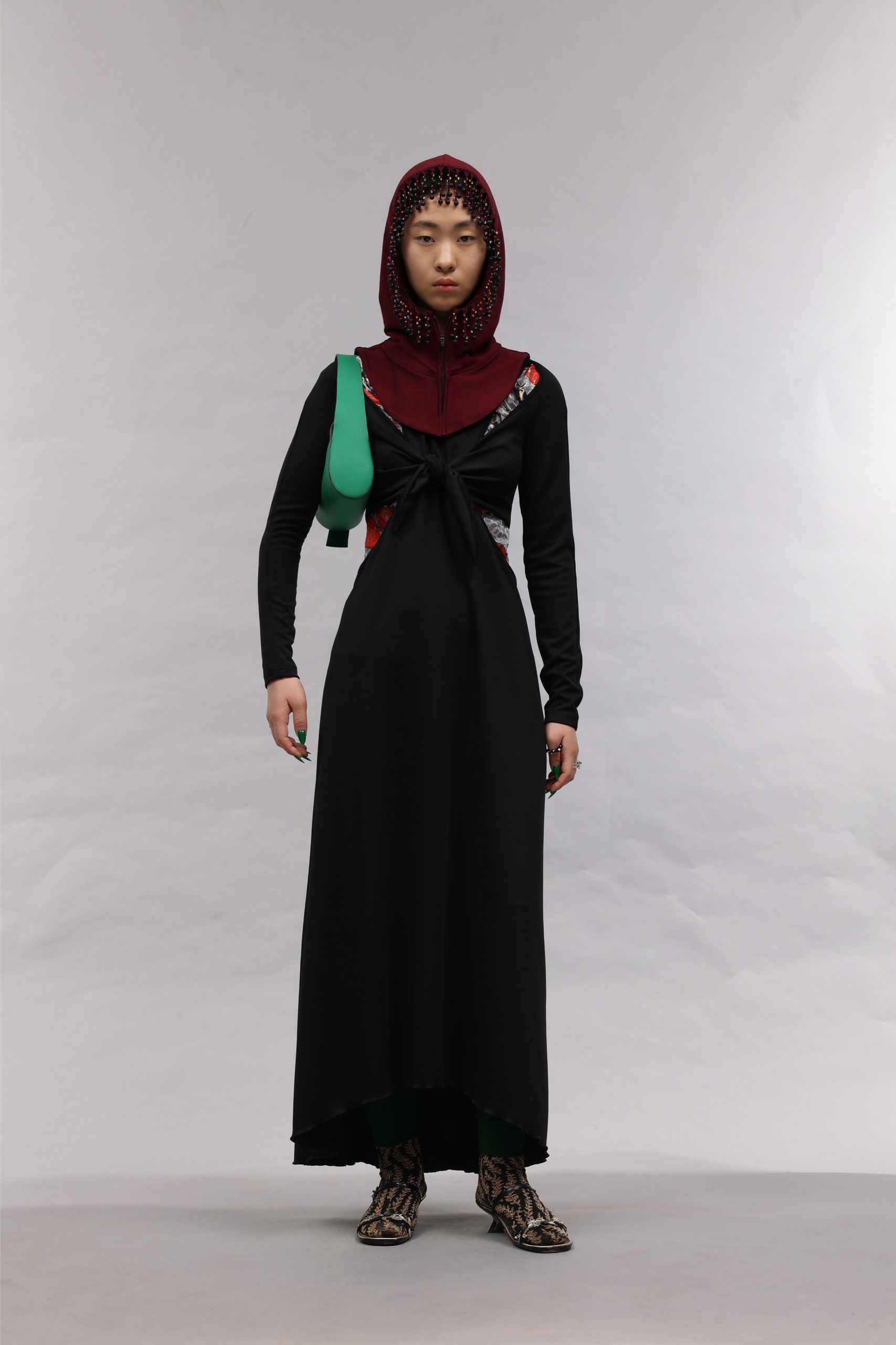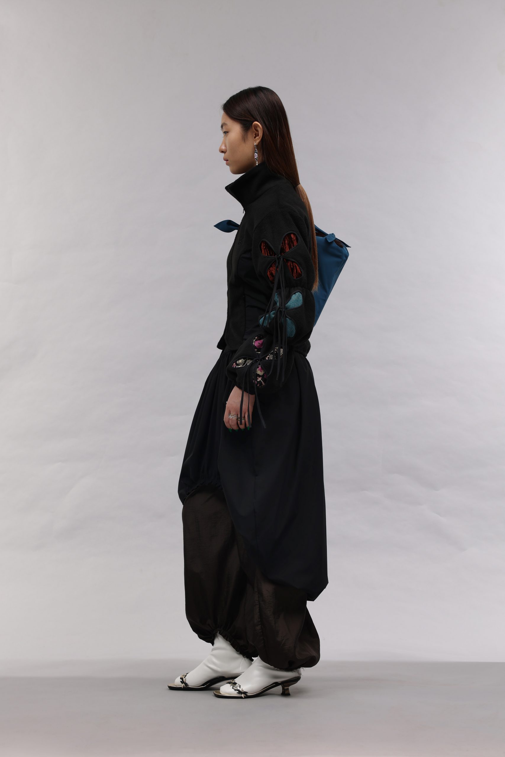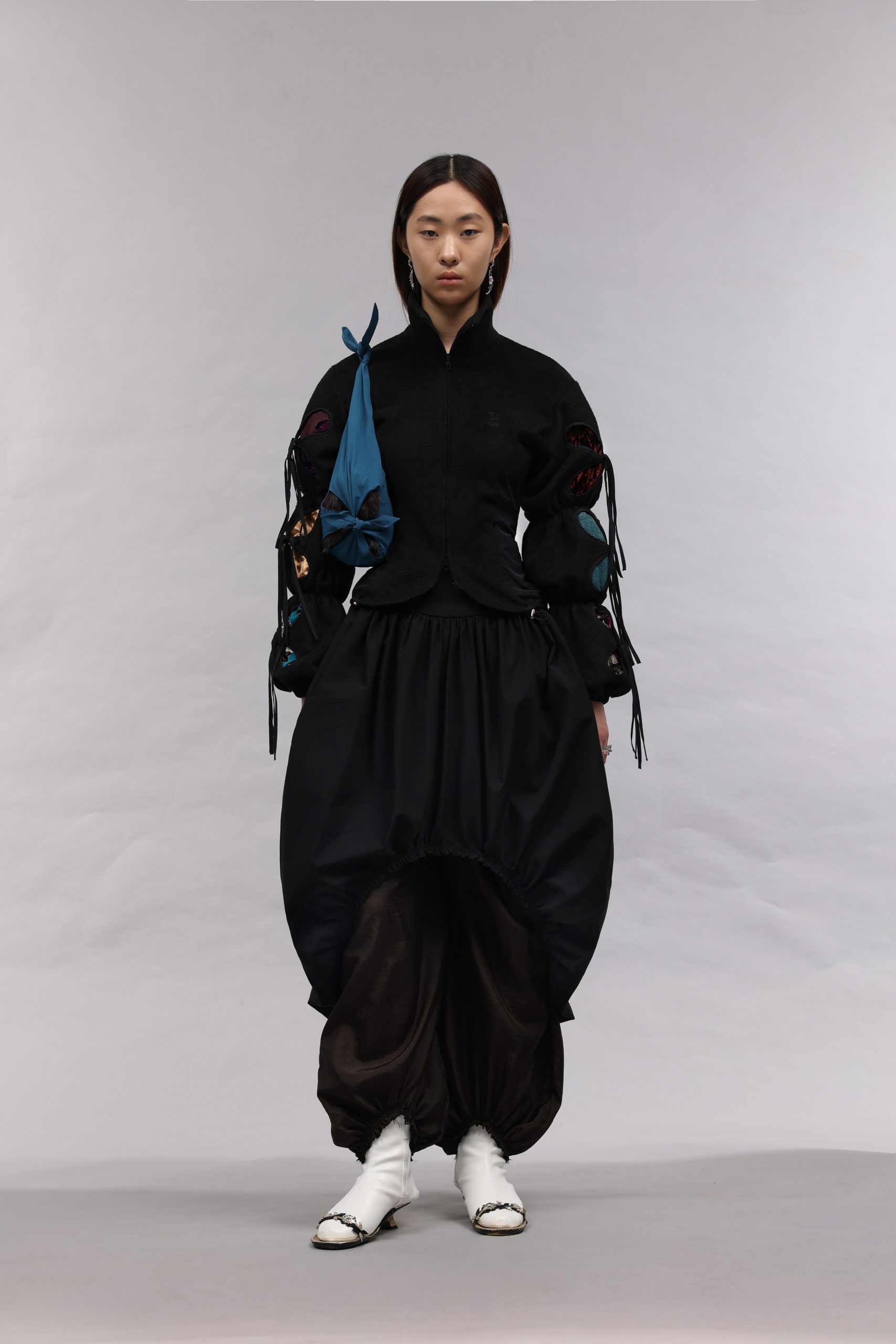 While black and white continue to be the foundation, this season’s J.Kim palette includes new hues that are inspired by the designs and artwork of Timurid miniatures. This collection aims to elevate local Uzbekistan women and their perceived low-brow fashion sense while re-contextualising them with the recognised art of Timurid illustrations. Some key pieces worth highlighting include dresses featuring bright vintage fabrics as well as cocoon-like coats and skirts made of single-colour nylon that are constructed to serve as a second layer.