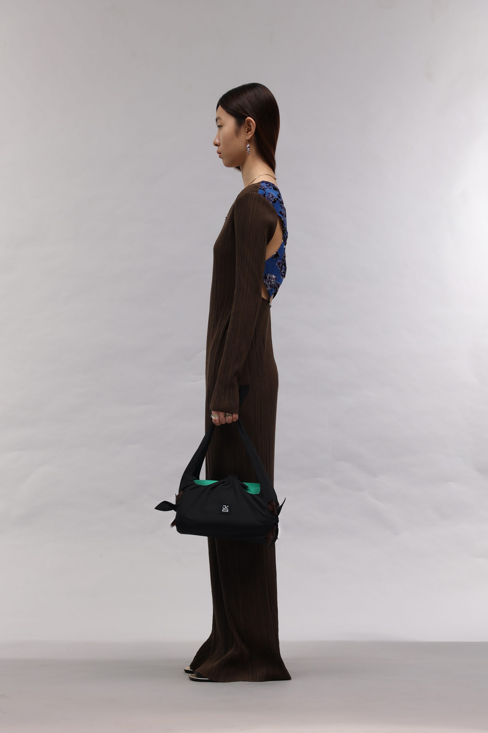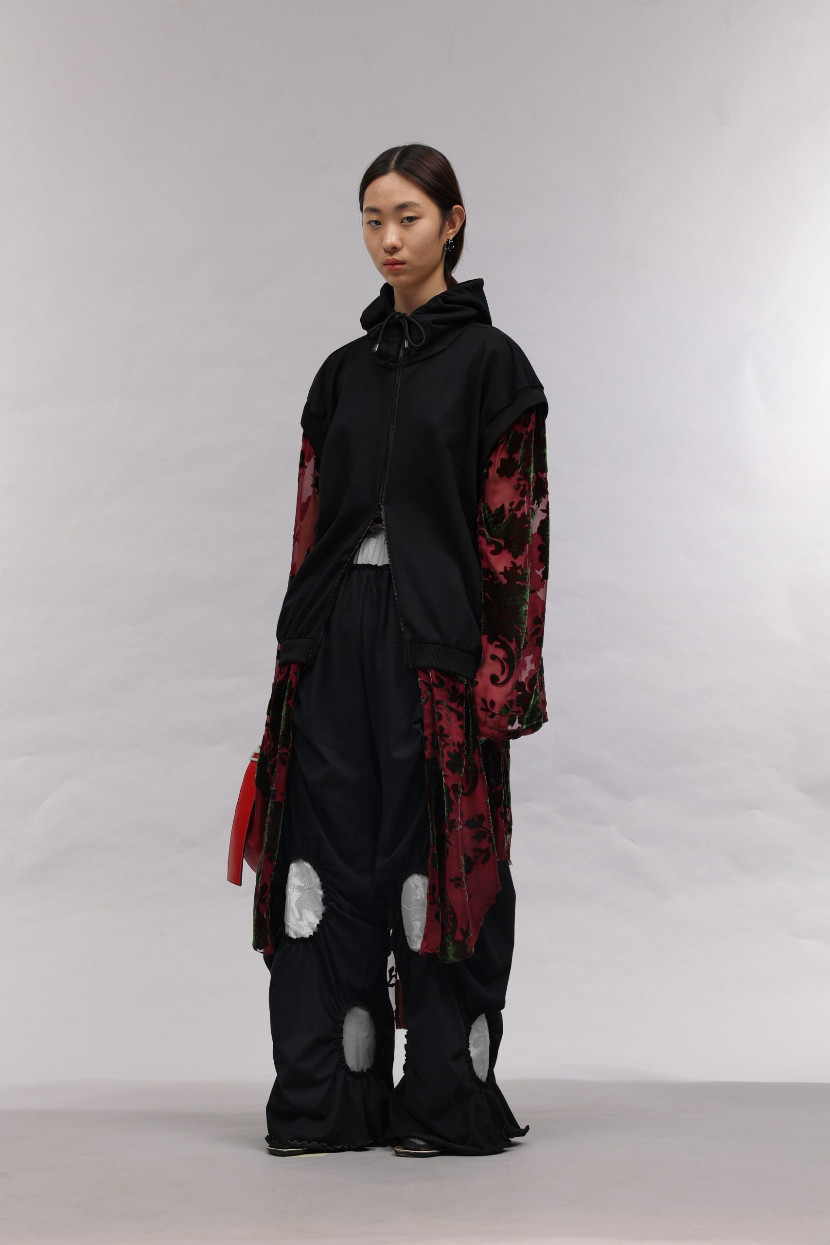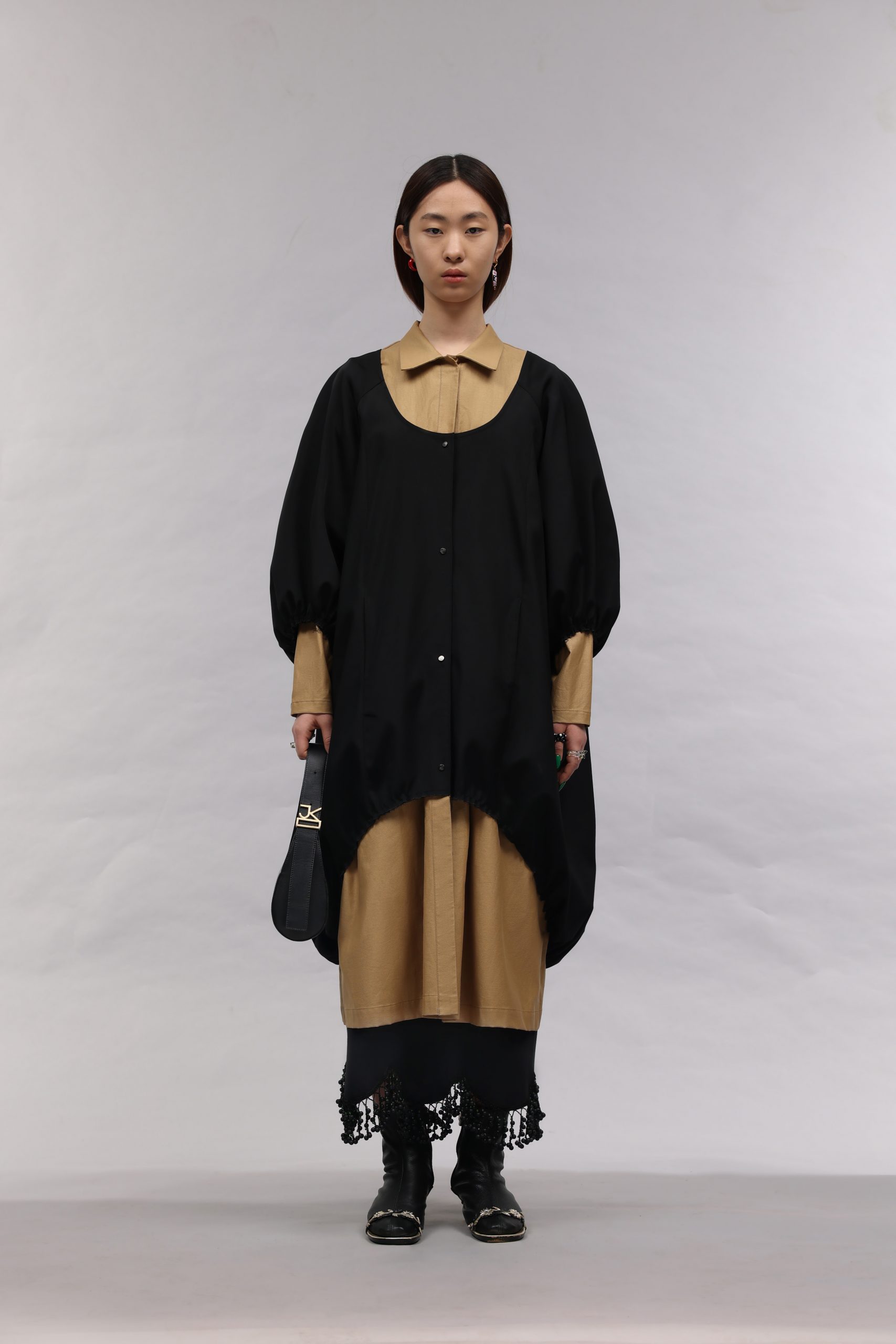 While black and white continue to be the foundation, this season’s J.Kim palette includes new hues that are inspired by the designs and artwork of Timurid miniatures. This collection aims to elevate local Uzbekistan women and their perceived low-brow fashion sense while re-contextualising them with the recognised art of Timurid illustrations. Some key pieces worth highlighting include dresses featuring bright vintage fabrics as well as cocoon-like coats and skirts made of single-colour nylon that are constructed to serve as a second layer.