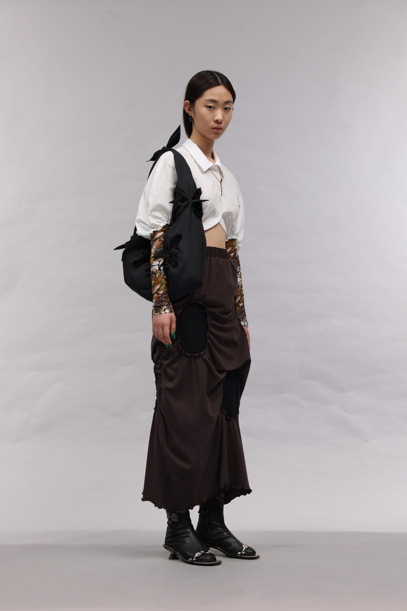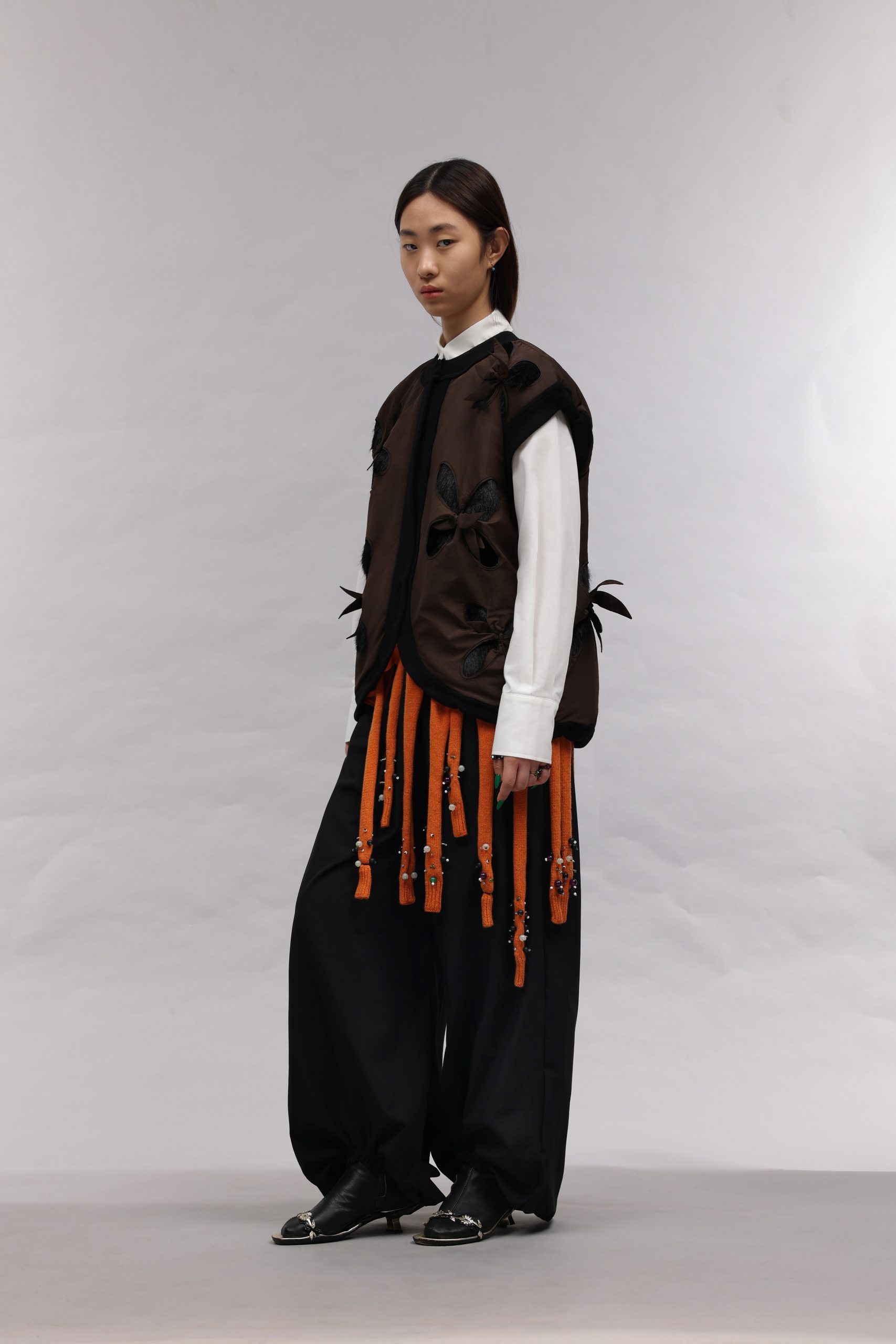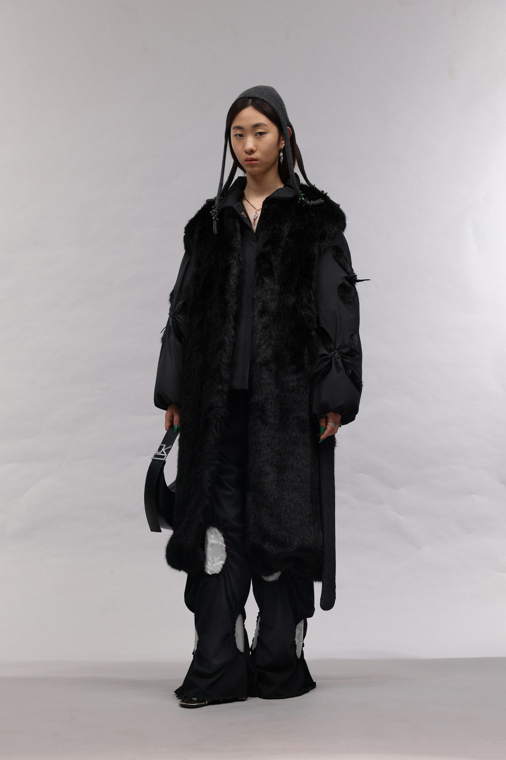 For the first time ever, the brand pairs cropped sweaters with cargo pants, which visually mimic several different types of wide trousers common in Central and Western Asia. Vests are widely used in regional Uzbek fashion. The latest take on the iconic J.Kim puffer jackets includes faux mink fur “wrapped” in nylon, mirroring the way locals wrap bales of goods in sacks, a visual signature present in the brand’s multiple previous items. Accessories include hoods that evoke traditional haircuts and those that fall midway between a scarf and a knotted shawl. Earrings and necklaces are inspired by nail art but also informed by the iconic tulip-shaped earrings of the Soviet-era Tashkent jewellery factory.