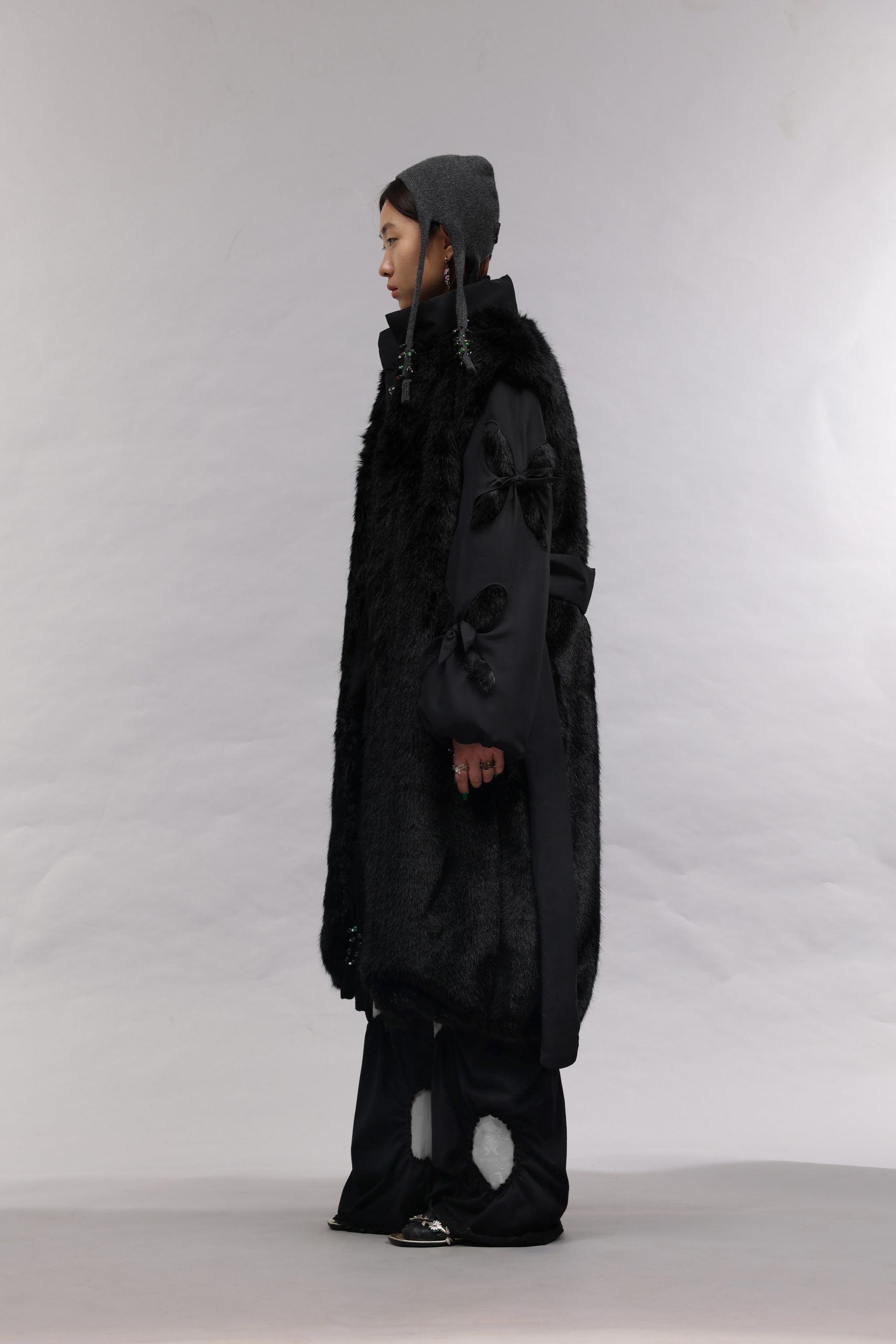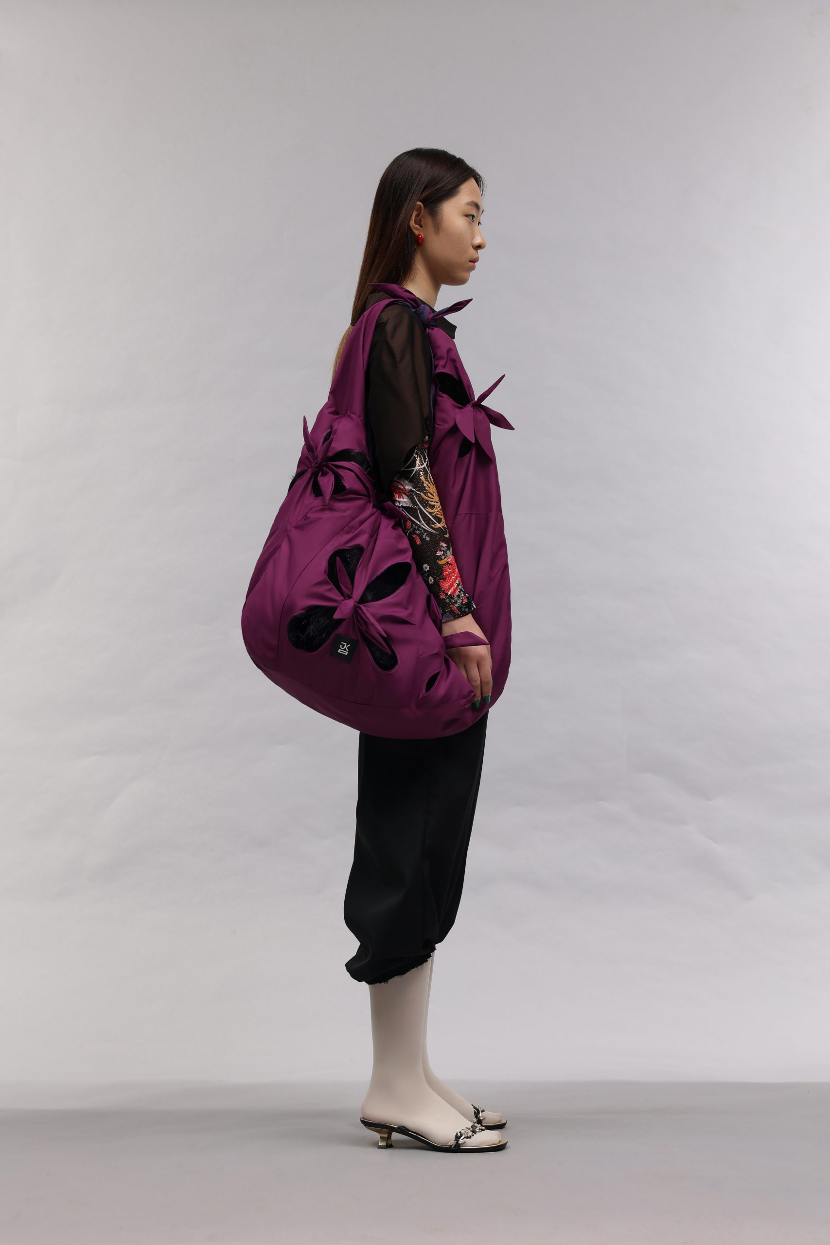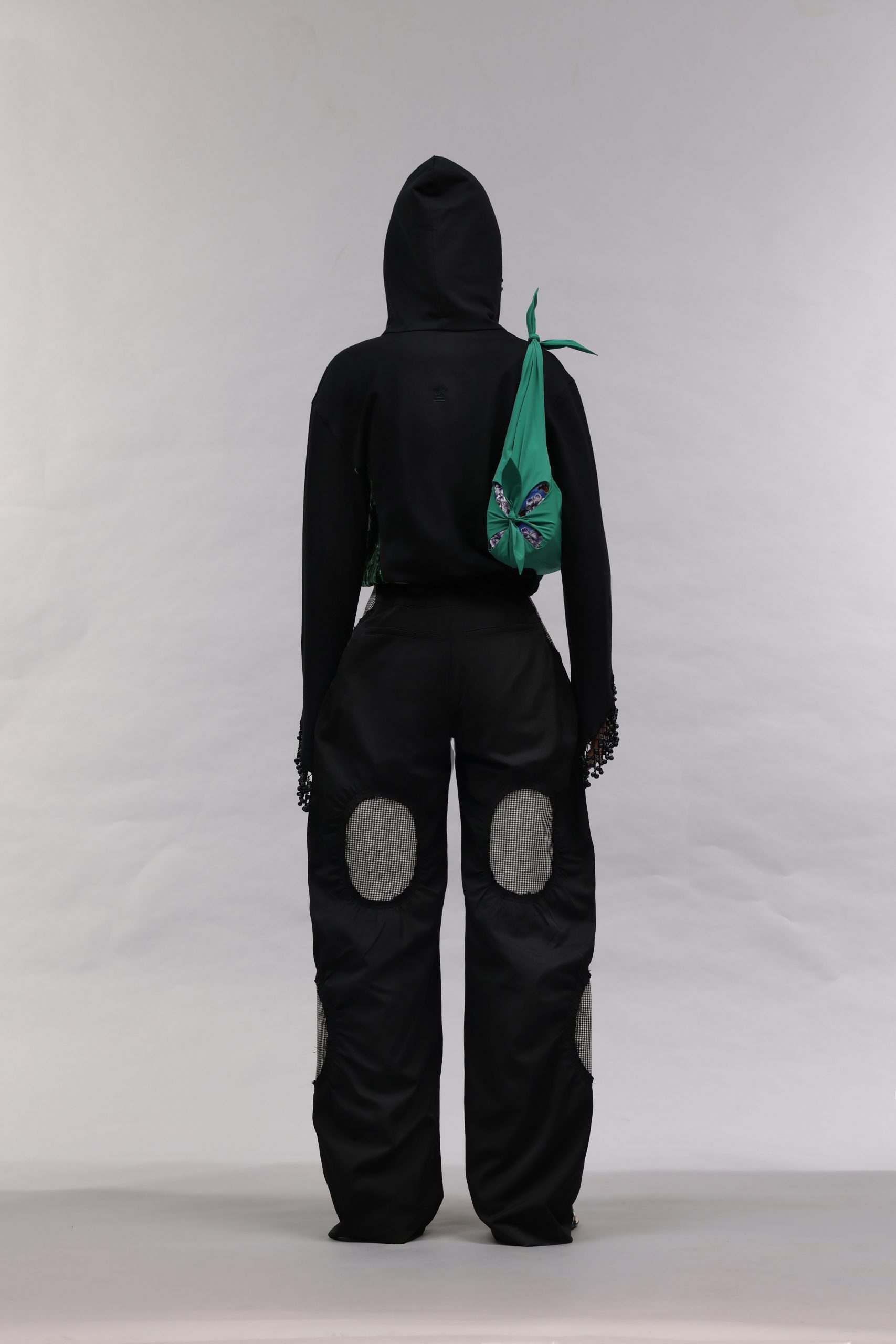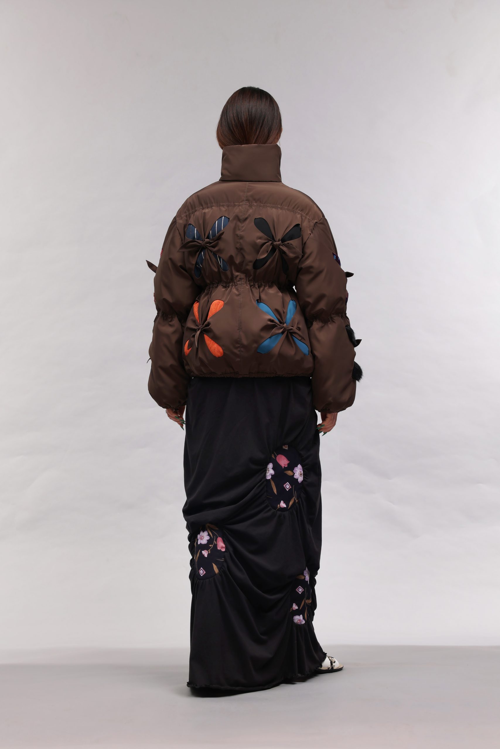 For the first time ever, the brand pairs cropped sweaters with cargo pants, which visually mimic several different types of wide trousers common in Central and Western Asia. Vests are widely used in regional Uzbek fashion. The latest take on the iconic J.Kim puffer jackets includes faux mink fur “wrapped” in nylon, mirroring the way locals wrap bales of goods in sacks, a visual signature present in the brand’s multiple previous items. Accessories include hoods that evoke traditional haircuts and those that fall midway between a scarf and a knotted shawl. Earrings and necklaces are inspired by nail art but also informed by the iconic tulip-shaped earrings of the Soviet-era Tashkent jewellery factory.