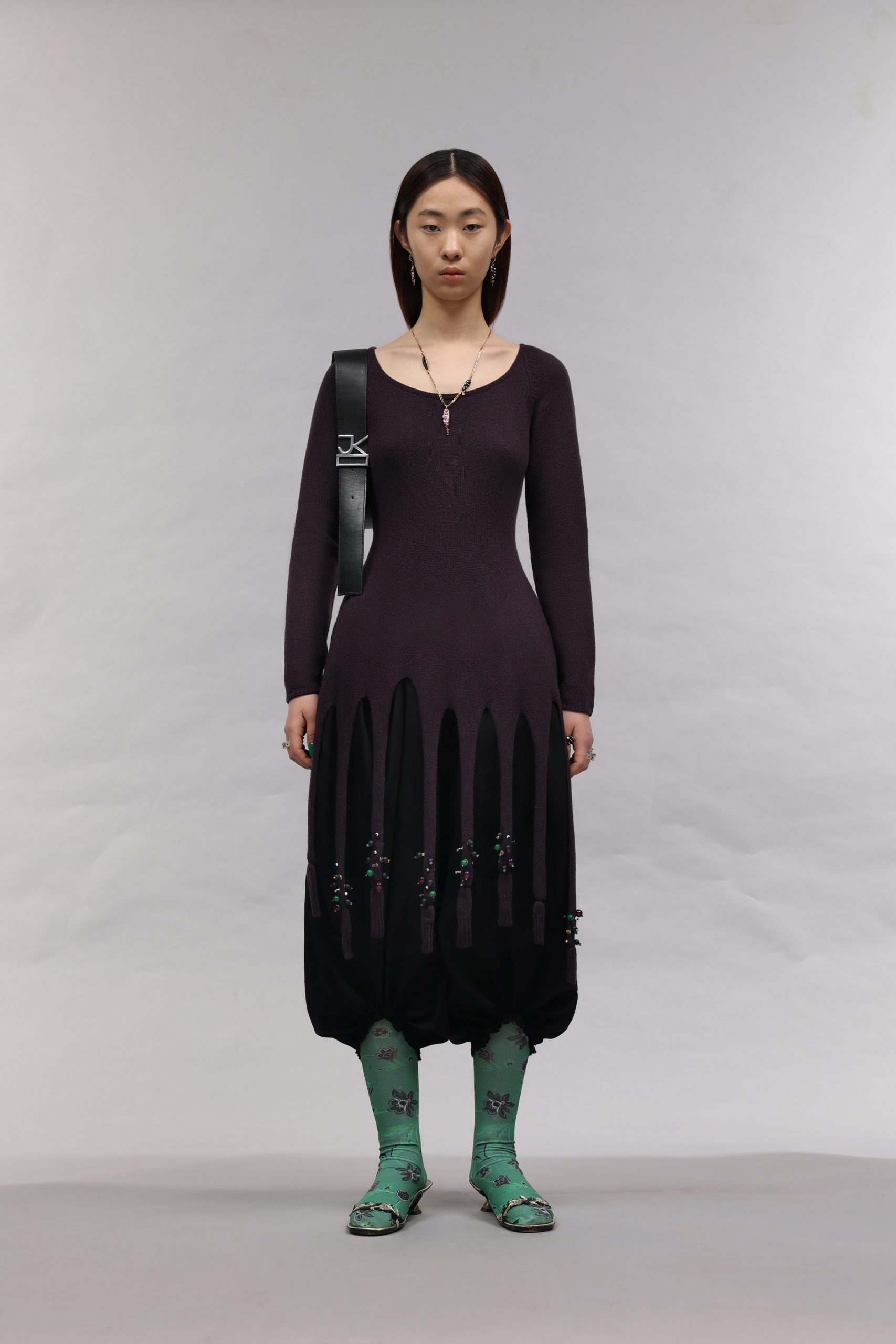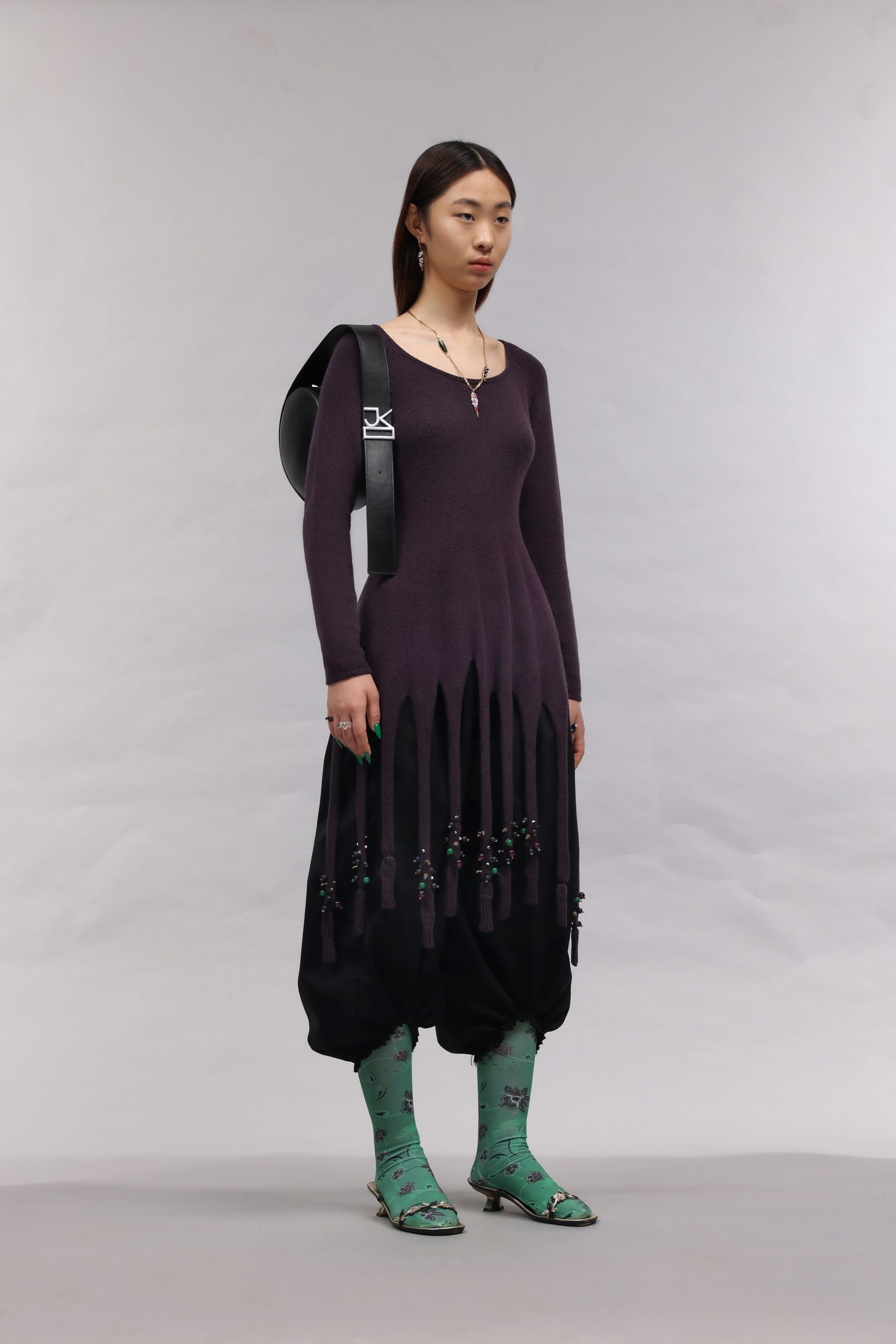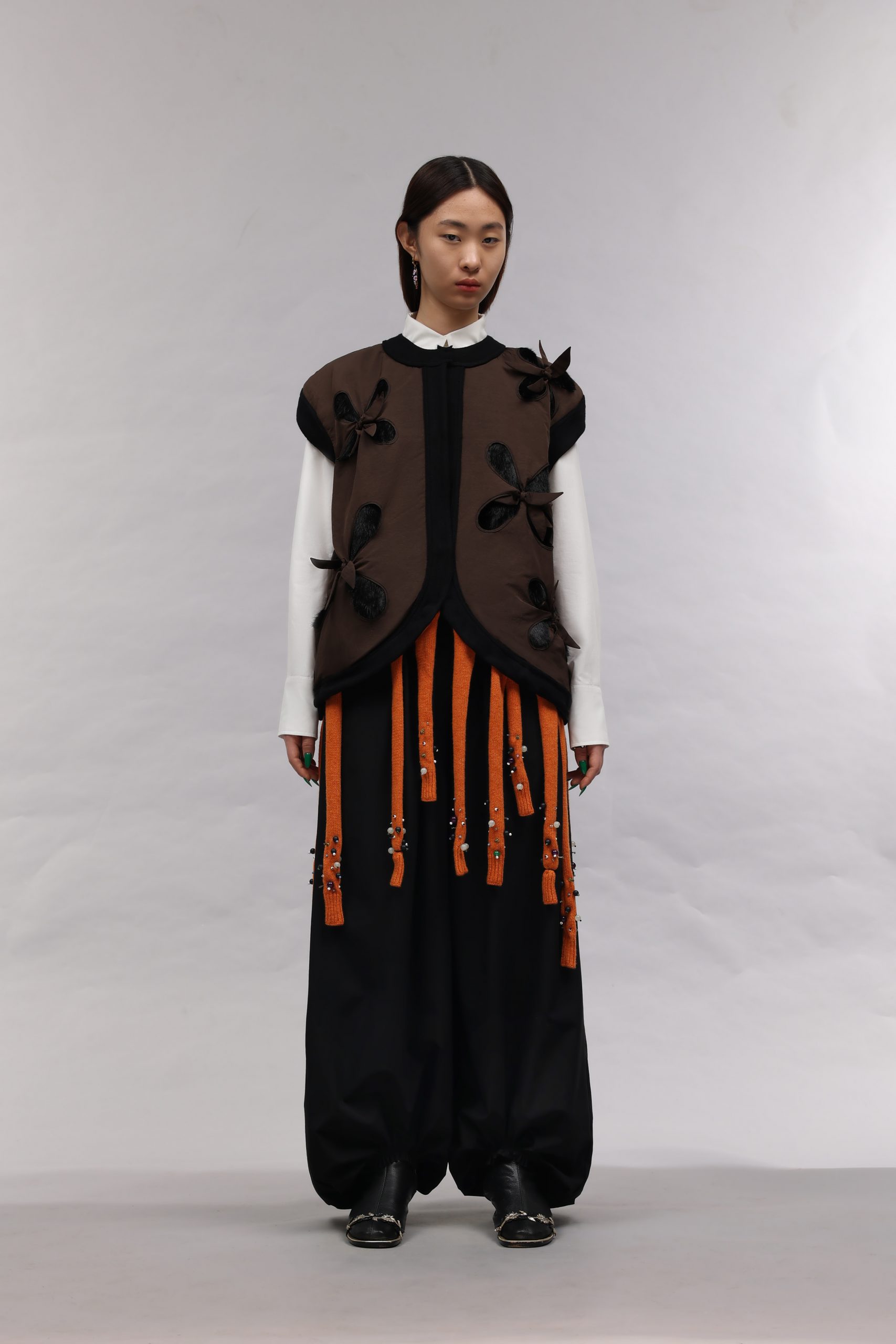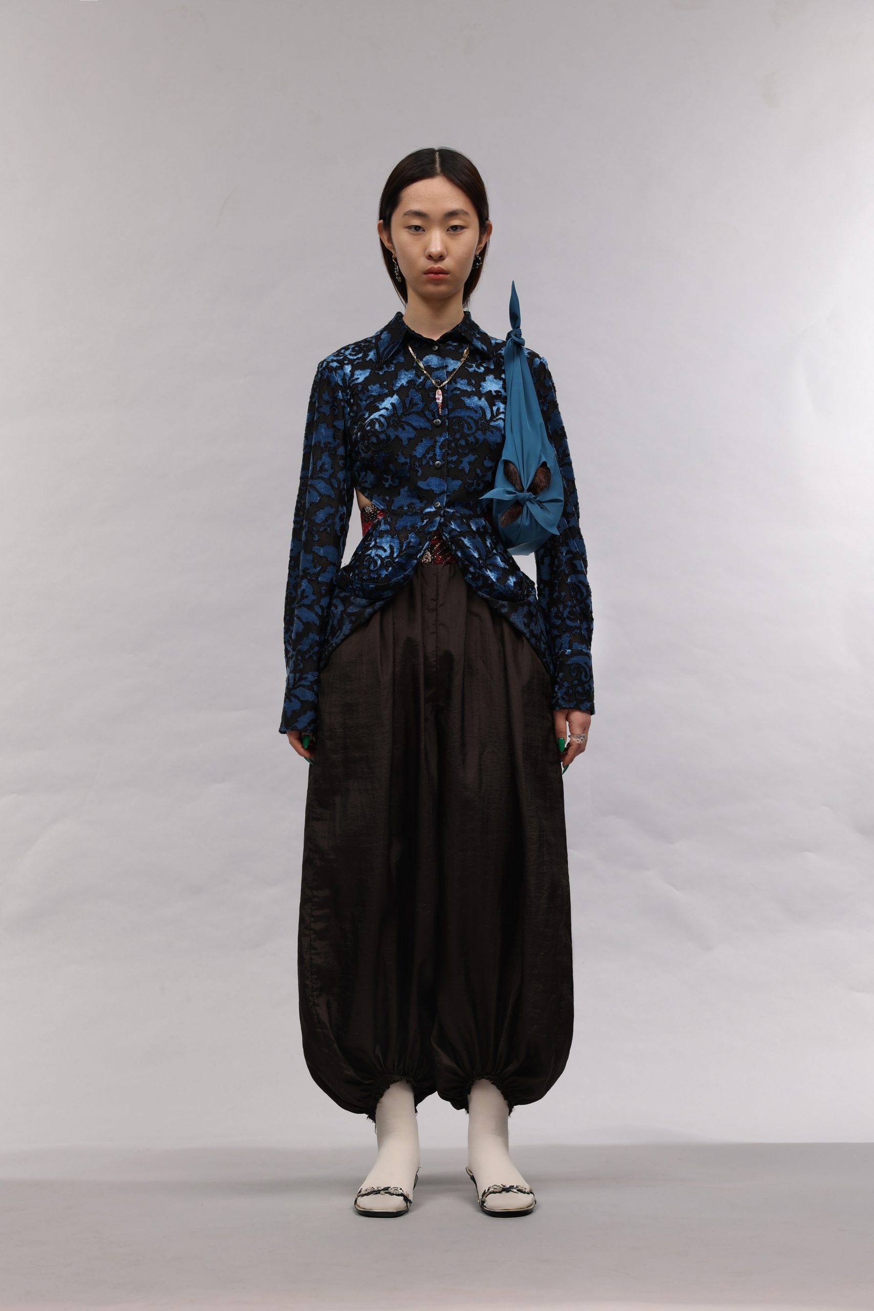 With special tributes to Uzbekistan and its tradition of eccentric hair styles, manicures, and layered multi-pattern clothing, J.Kim’s FW23 collection is inspired by the idea of a meticulously styled woman. The designer skillfully reinterprets the fashion of Uzbekistani women within this acknowledged creative history using a design aesthetic informed by the revered Timurid miniature art form.