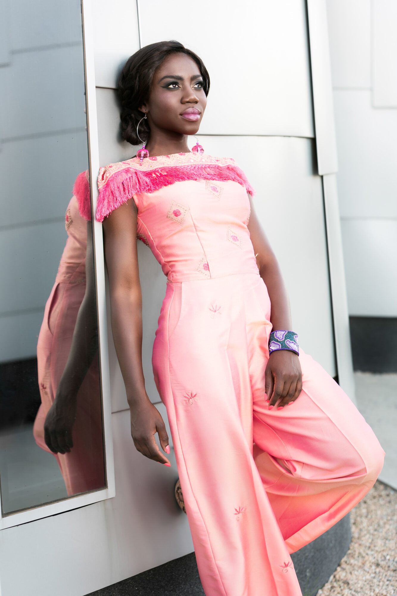 In this jumpsuit series, Sheila Afari is wearing our silk Liz Ogumbo tassel-square-shoulder jumpsuit that works great from day-2-night. Whether in sandals or flats for garden parties and sunsets or in heels, this versatile wardrobe staple jumpsuit will certainly still stir-up magic anywhere you take her.