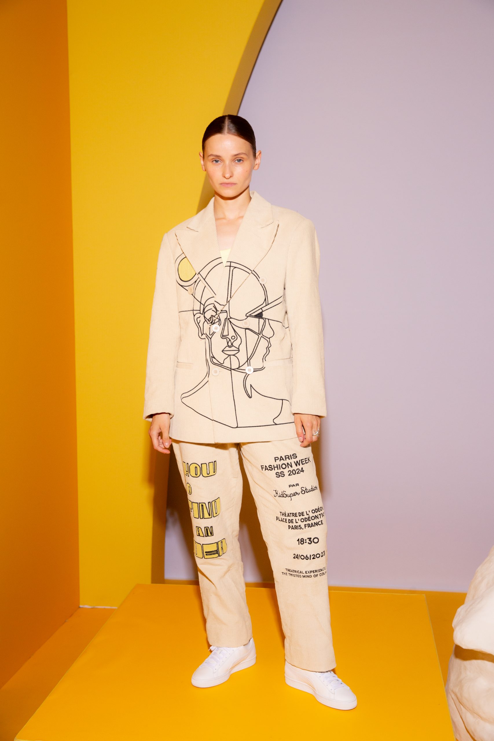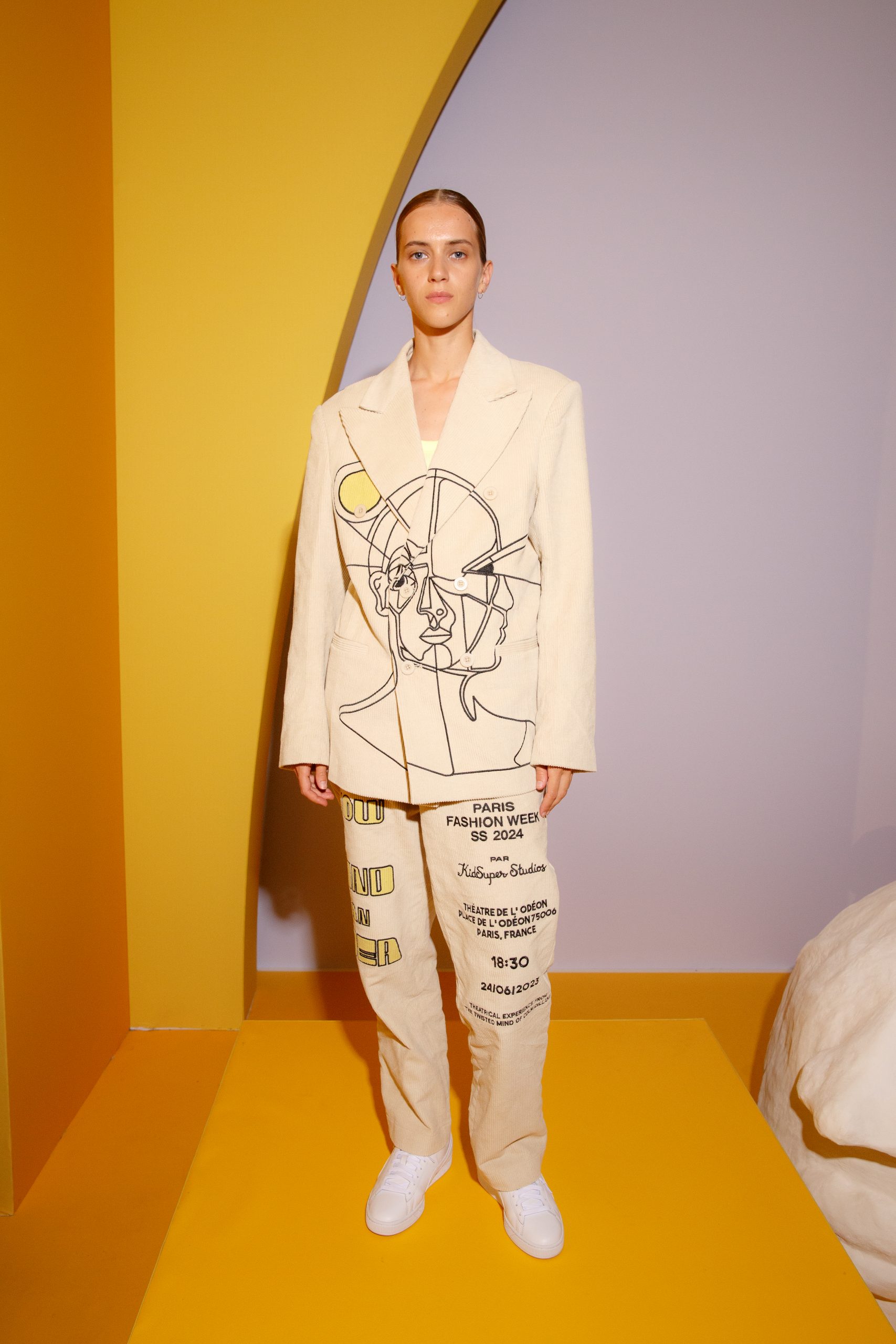 The play encapsulated the eccentricity and distinctive visual and narrative styles that KidSuper is known for. In a deeply personal reflection on creativity, originality, and recognition, Dillane bared his creative process for all to see. The collection itself masterfully embodied the KidSuper playbook, with art, vibrant colours, playful prints, and collages adorning everything from classic streetwear to animated tailoring and coats.