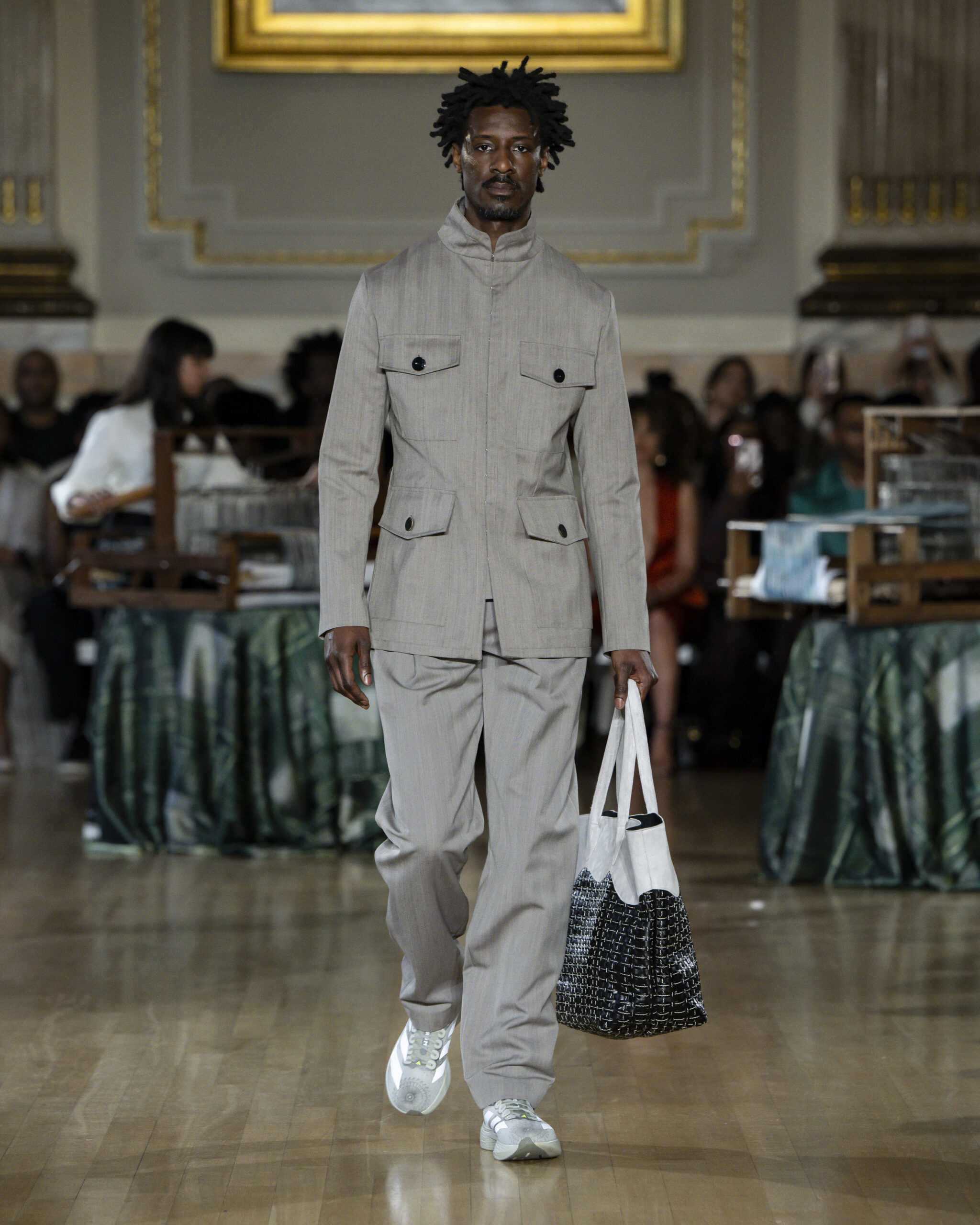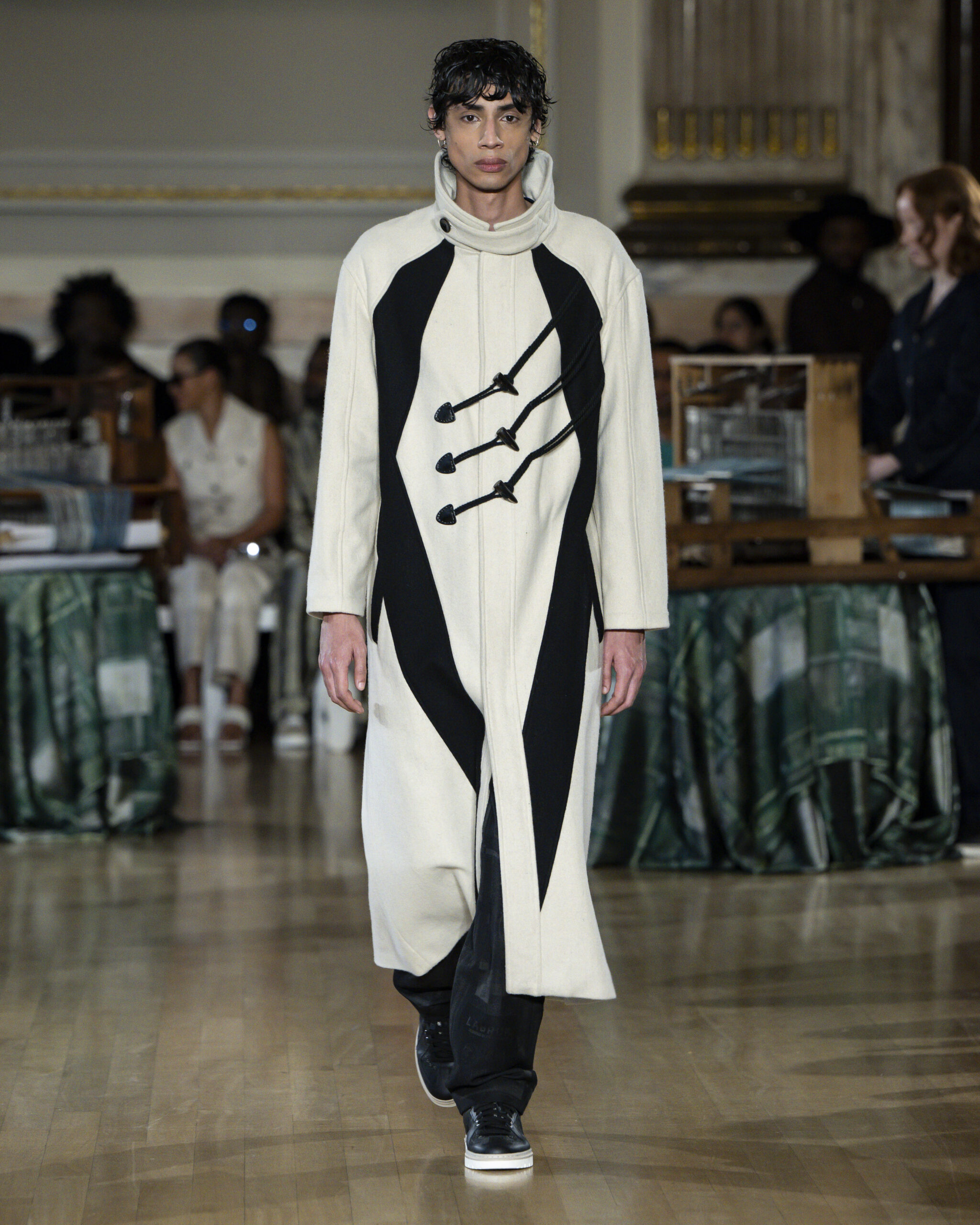Model walking in LABRUM Autumn Winter 2026 Threads of Osmosis runway show featuring tailored silhouettes and diaspora-inspired textiles