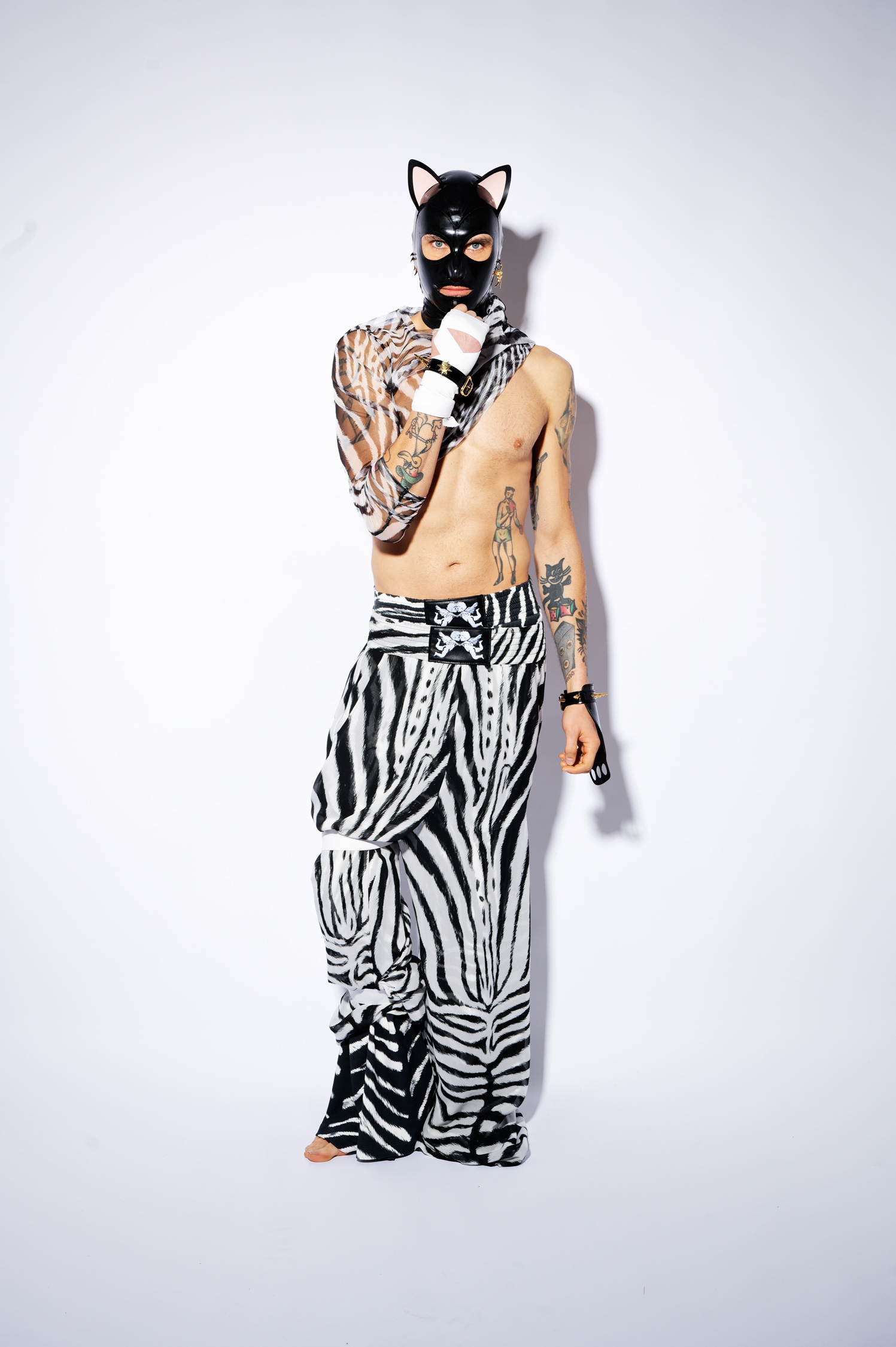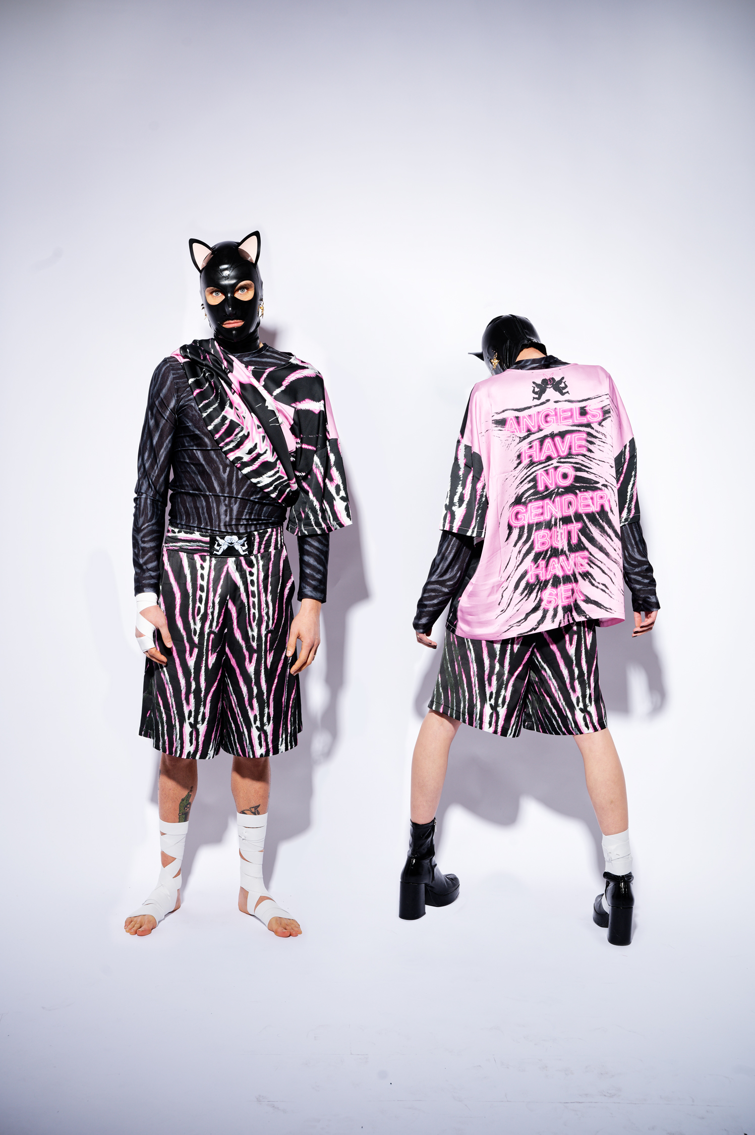 The collection takes its name from a 1979 song of the Italian artist Renato Zero: the theme of bartering is declined within a couple of partners as an exchange between love and sex, in the imagery of night, glamour and excess. The logo itself, formed by two Cupids kissing, is dressed in theme by wearing a Playboy mask on their face, angels having sex without having it: the phrase “ANGELS HAVE NO GENDER BUT HAVE SEX” sums up the collection and it’s printed on t-shirts and engraved on bijoux. A printed overdose of the iconic “Angelic Zebra Print” on silk, stretch and sheer fabrics is the centerpiece of the collection, developing strong contrasts between black and white, with black vinyl leather accessories and bijoux in gold.
