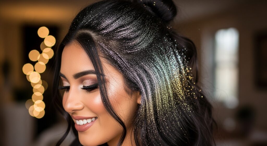 This is the playful, high-energy look for the person who embraces holiday shimmer. It is incredibly effective, requires almost no styling skill, and is a fantastic way to disguise roots or dirty hair.