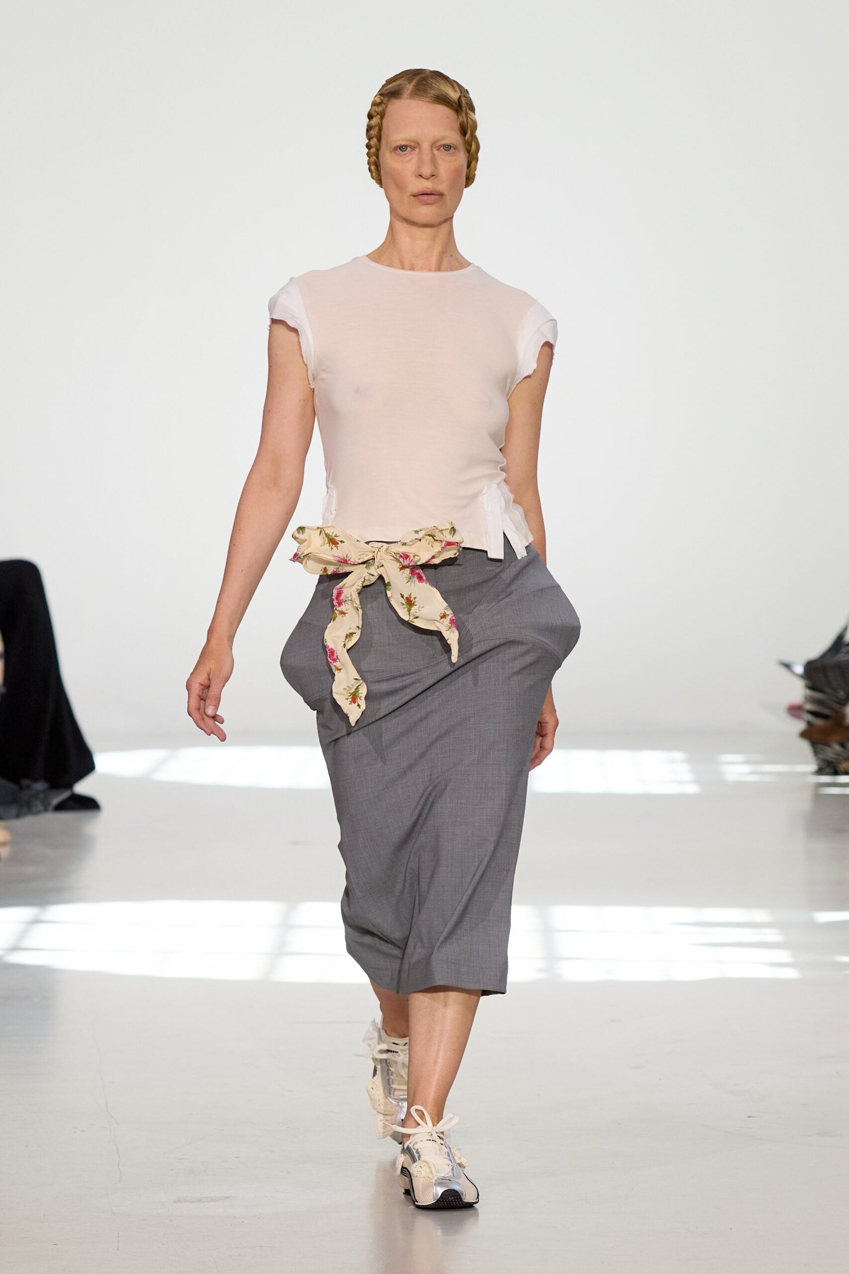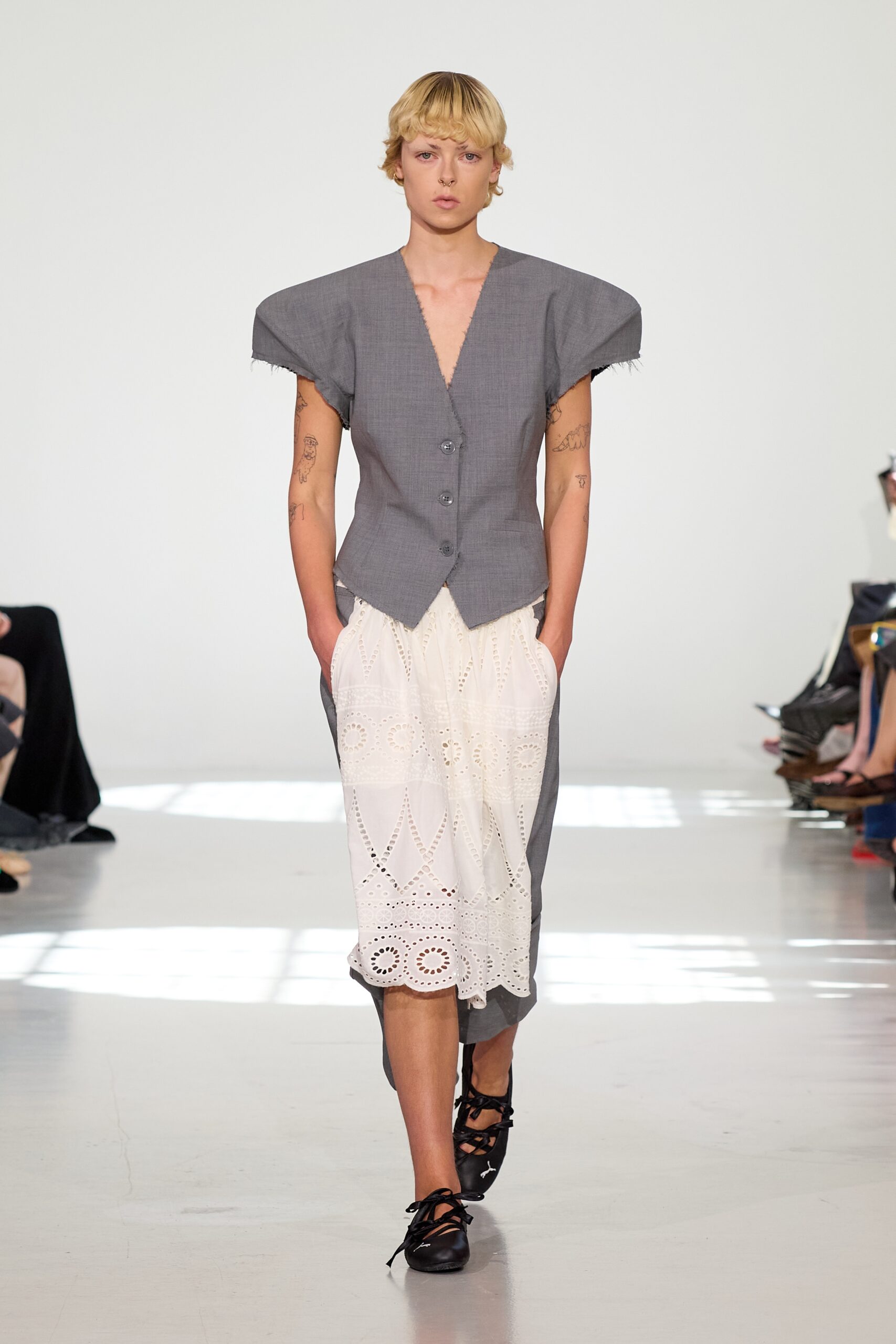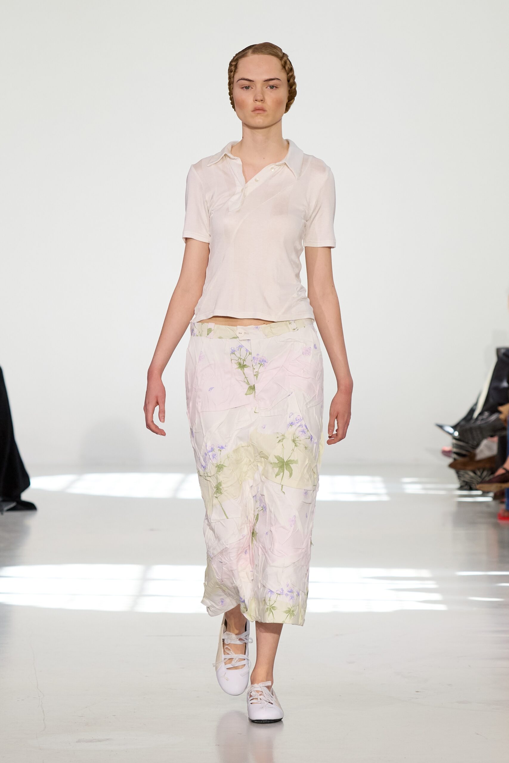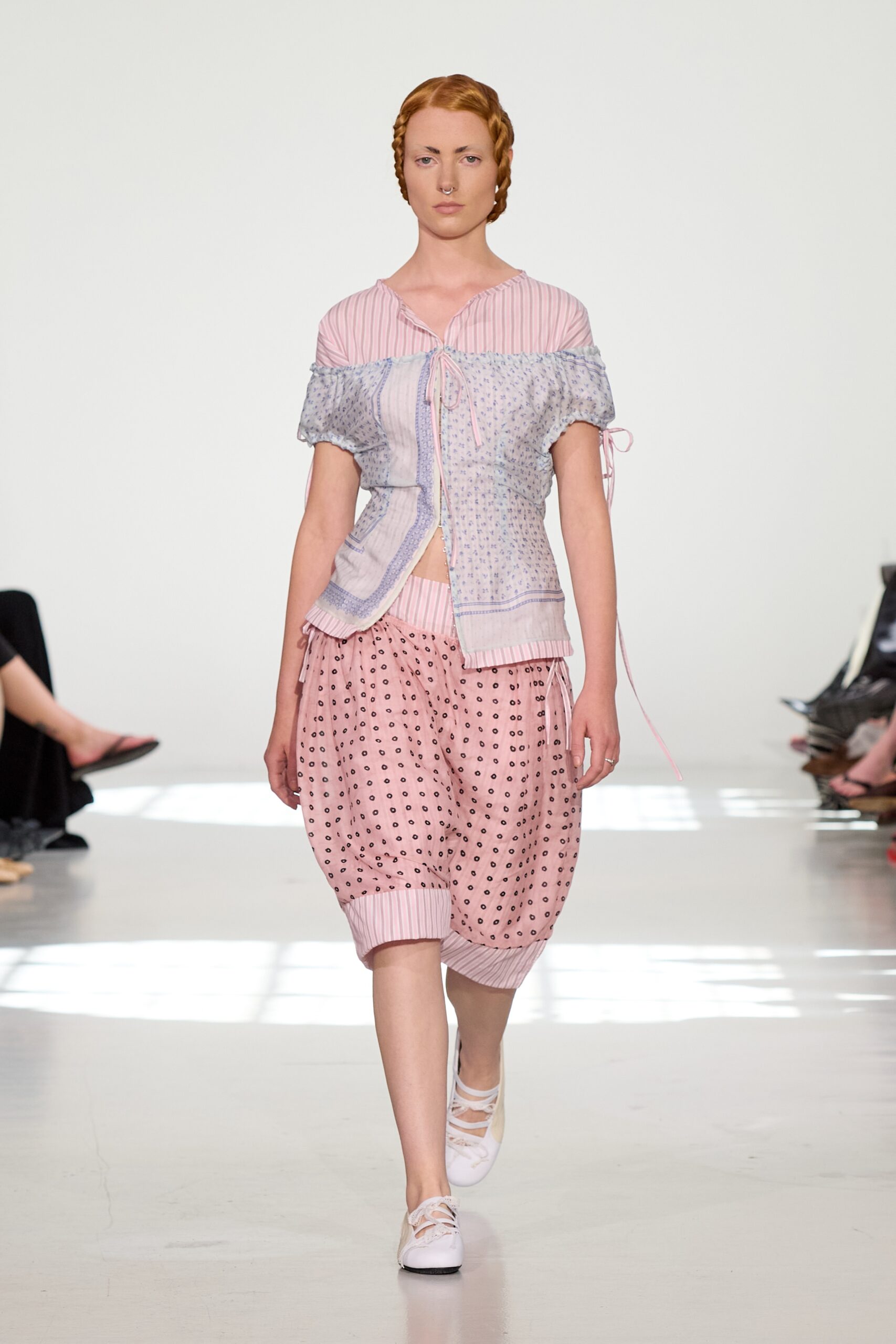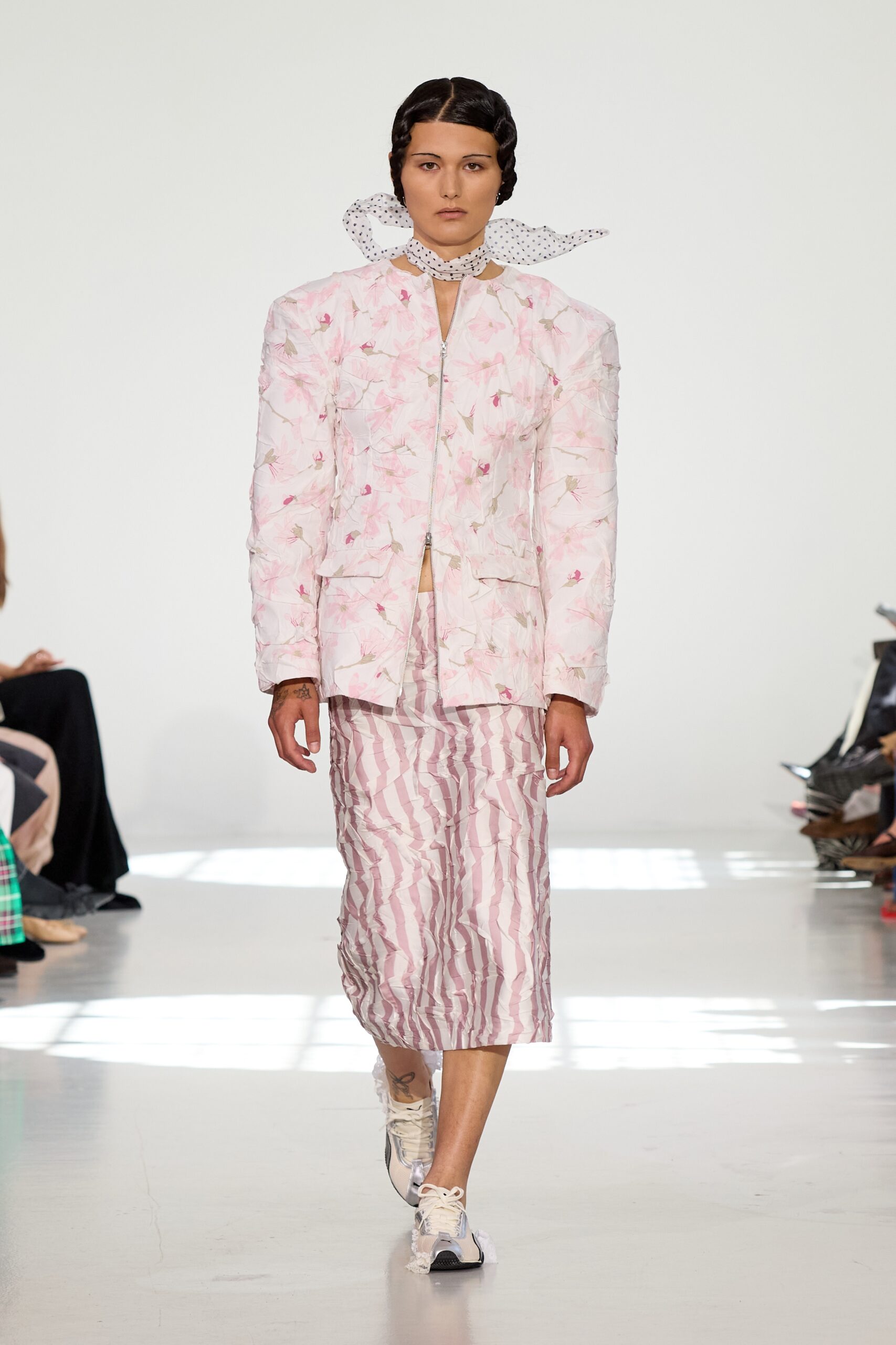 Deadstock fabrics and vintage home textiles are reworked with signature Rave Rvw flair: wrinkled checks, floral ribbed cotton, sheer voiles, gingham, and heat-pressed bed linens reborn as structured suiting. A standout? A pink floral blazer with a matching pencil skirt, sharp in shape but tender in tone — ceremonial, yet completely wearable.