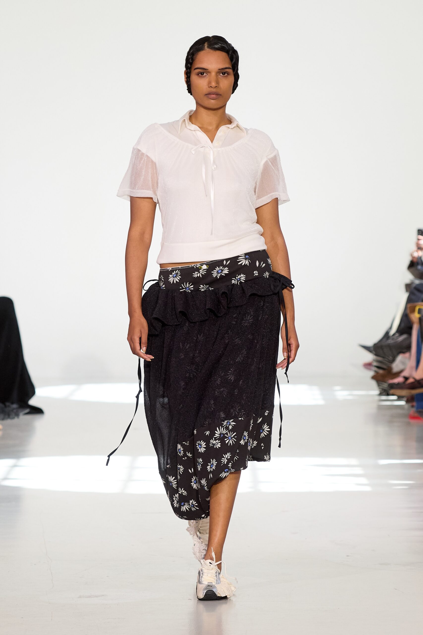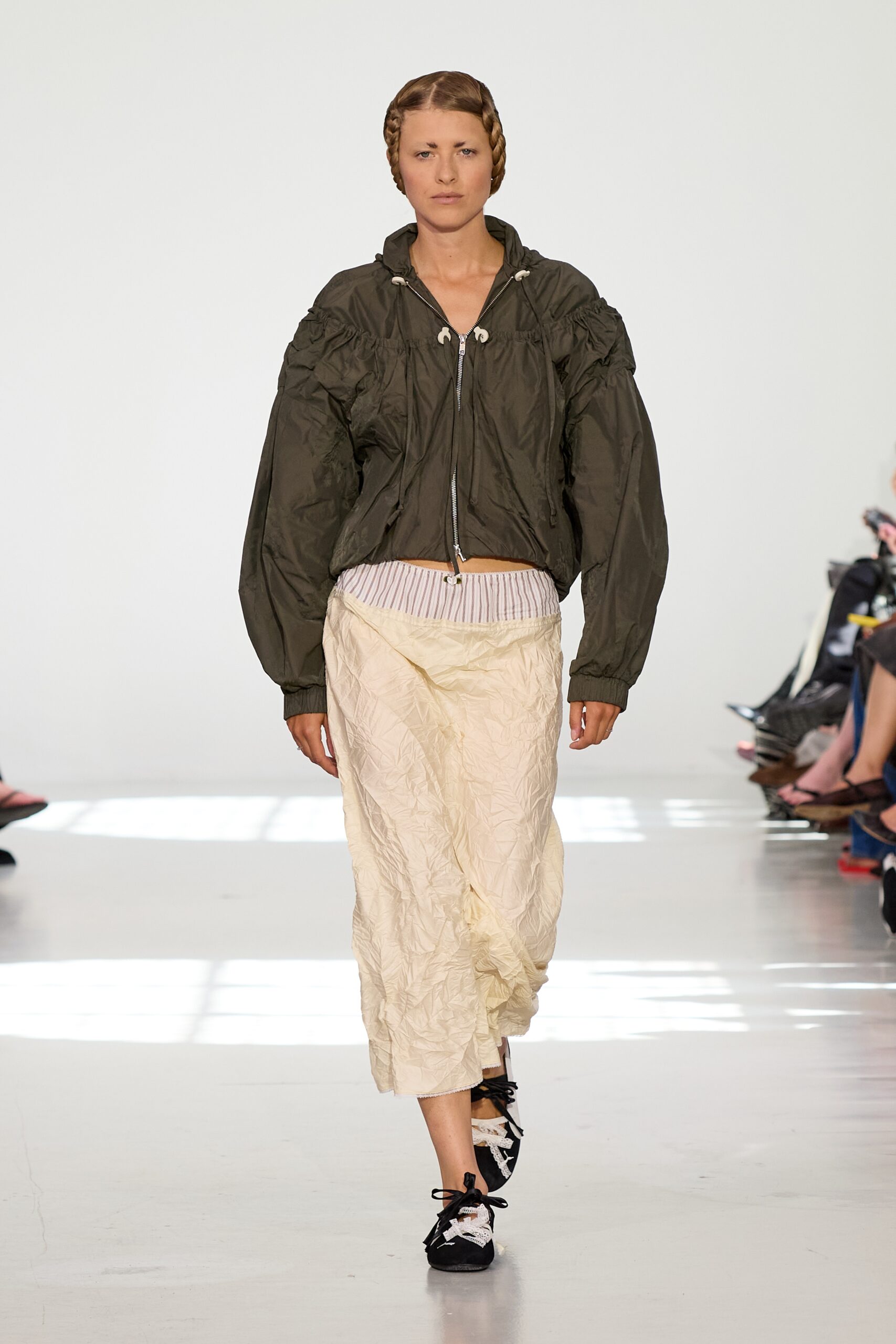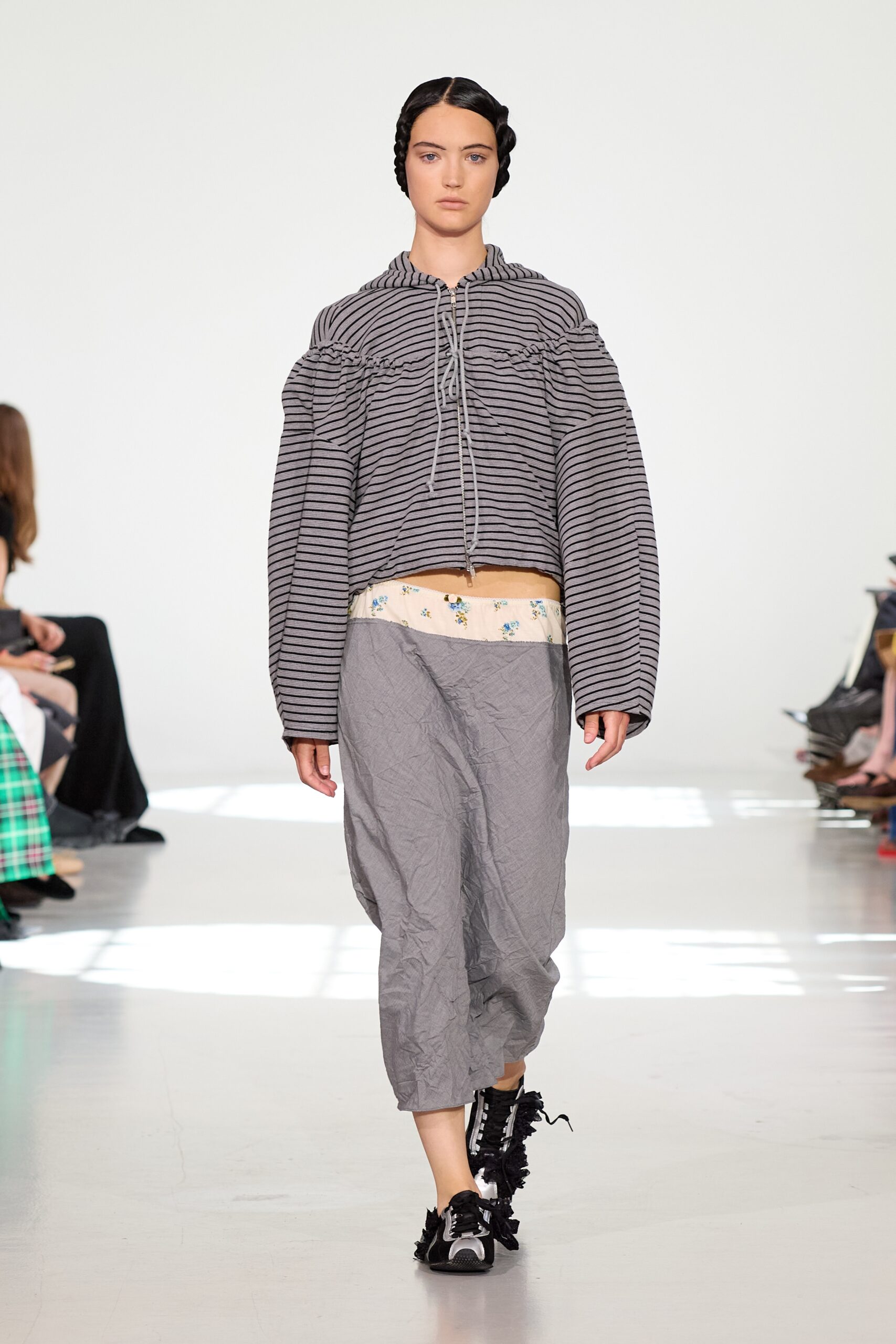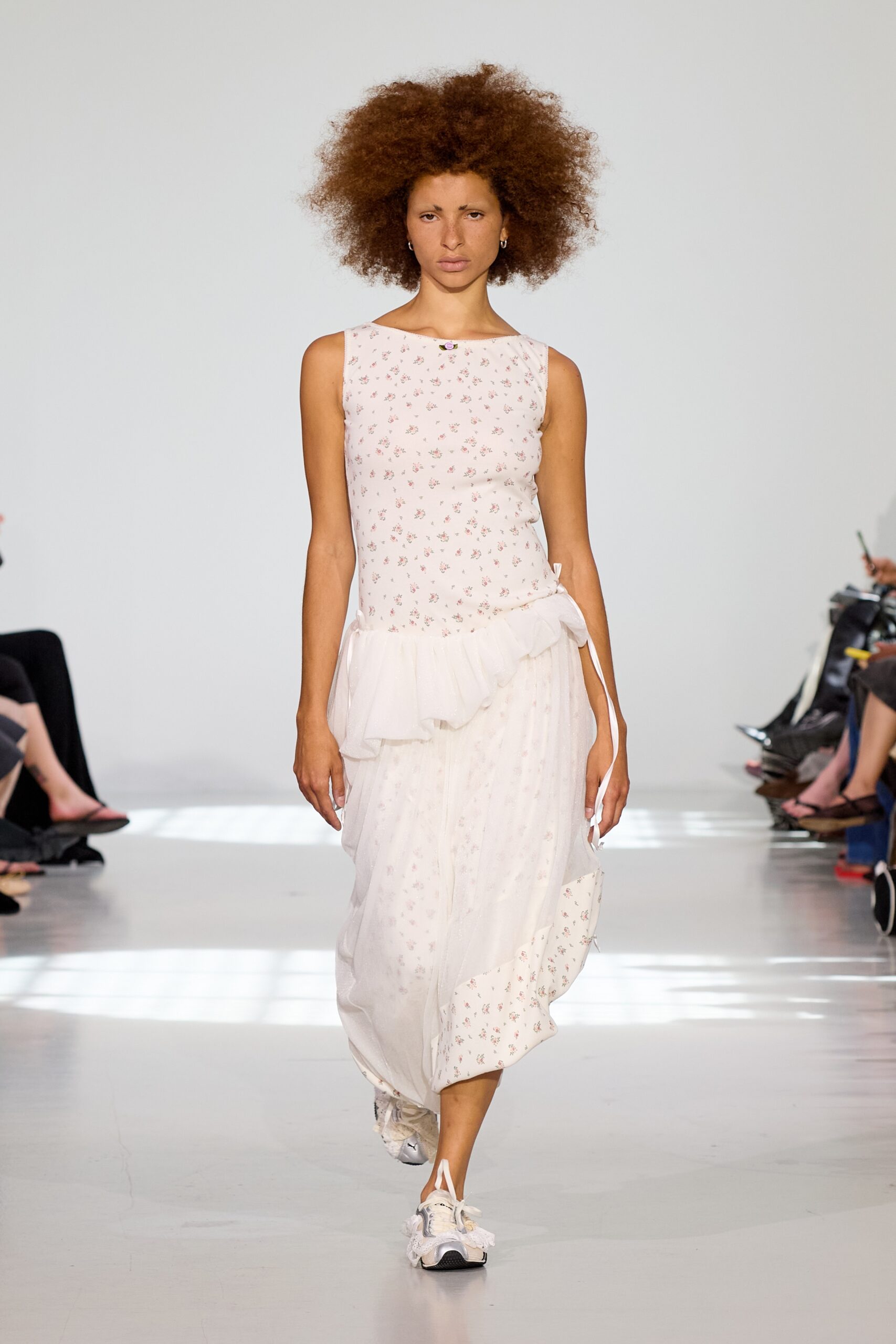 Deadstock fabrics and vintage home textiles are reworked with signature Rave Rvw flair: wrinkled checks, floral ribbed cotton, sheer voiles, gingham, and heat-pressed bed linens reborn as structured suiting. A standout? A pink floral blazer with a matching pencil skirt, sharp in shape but tender in tone — ceremonial, yet completely wearable.