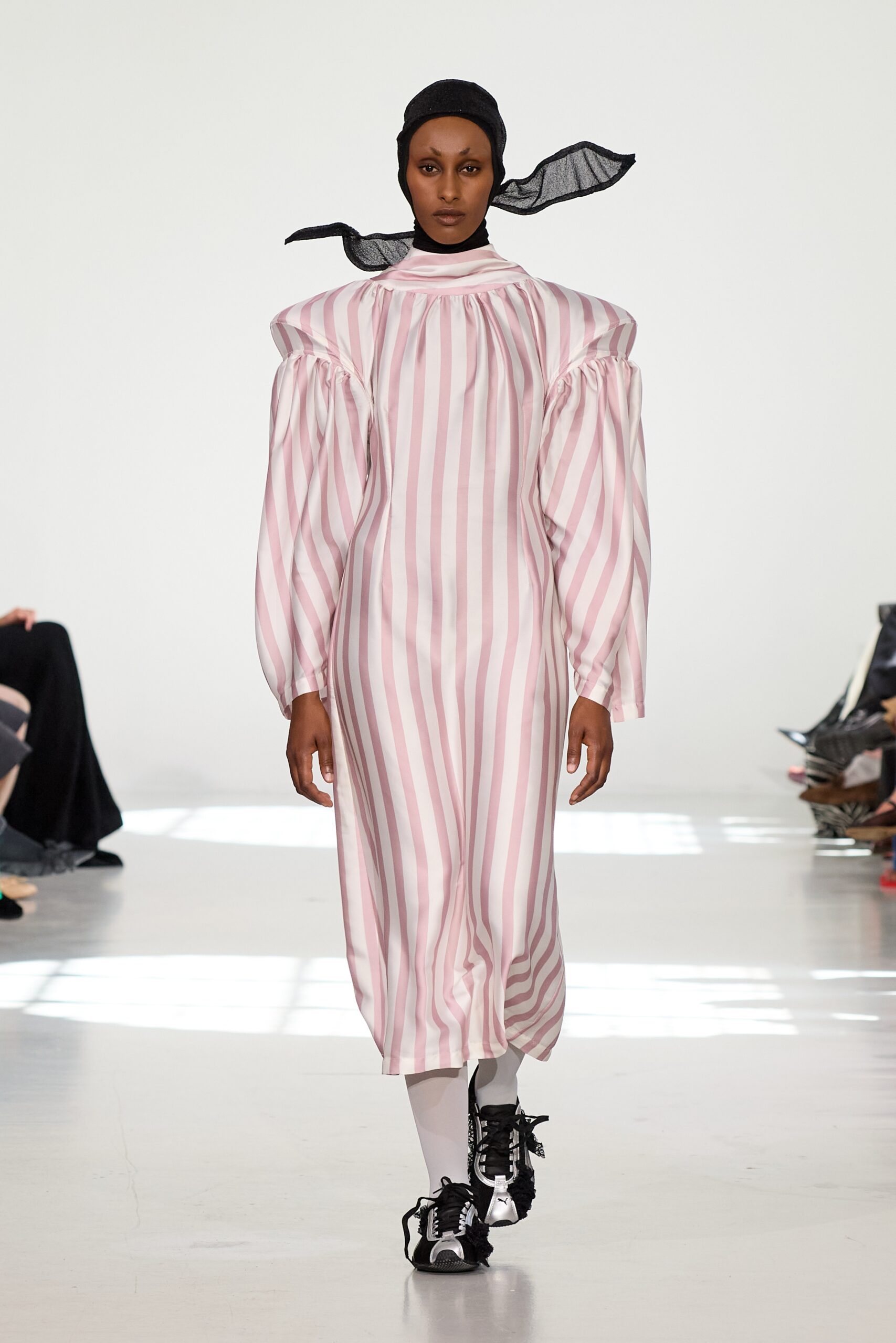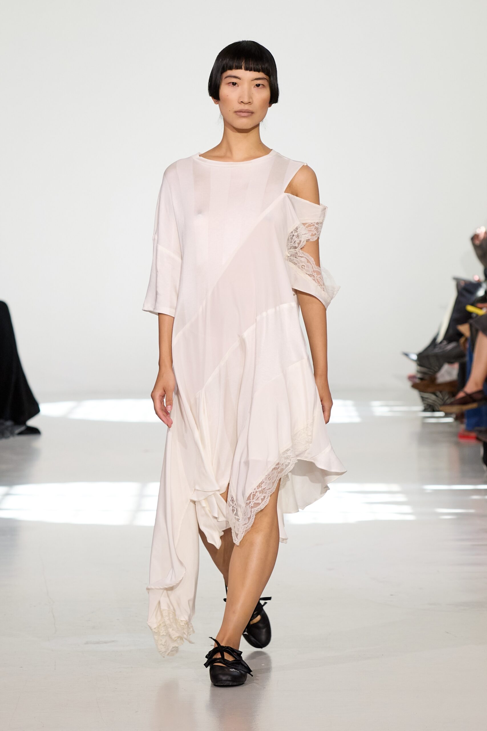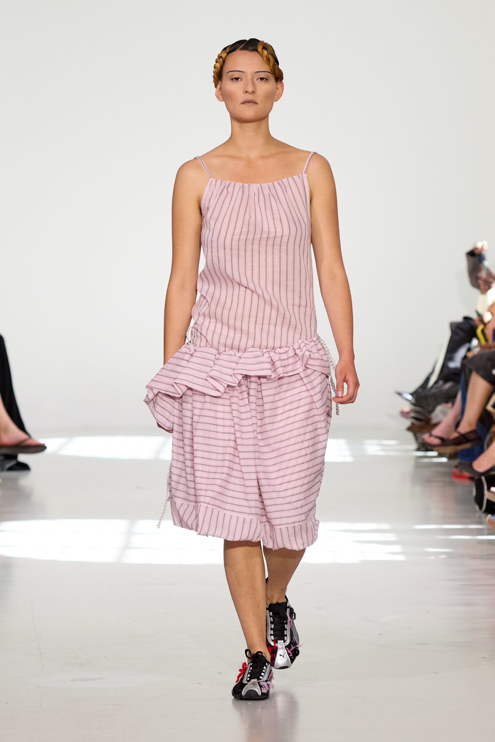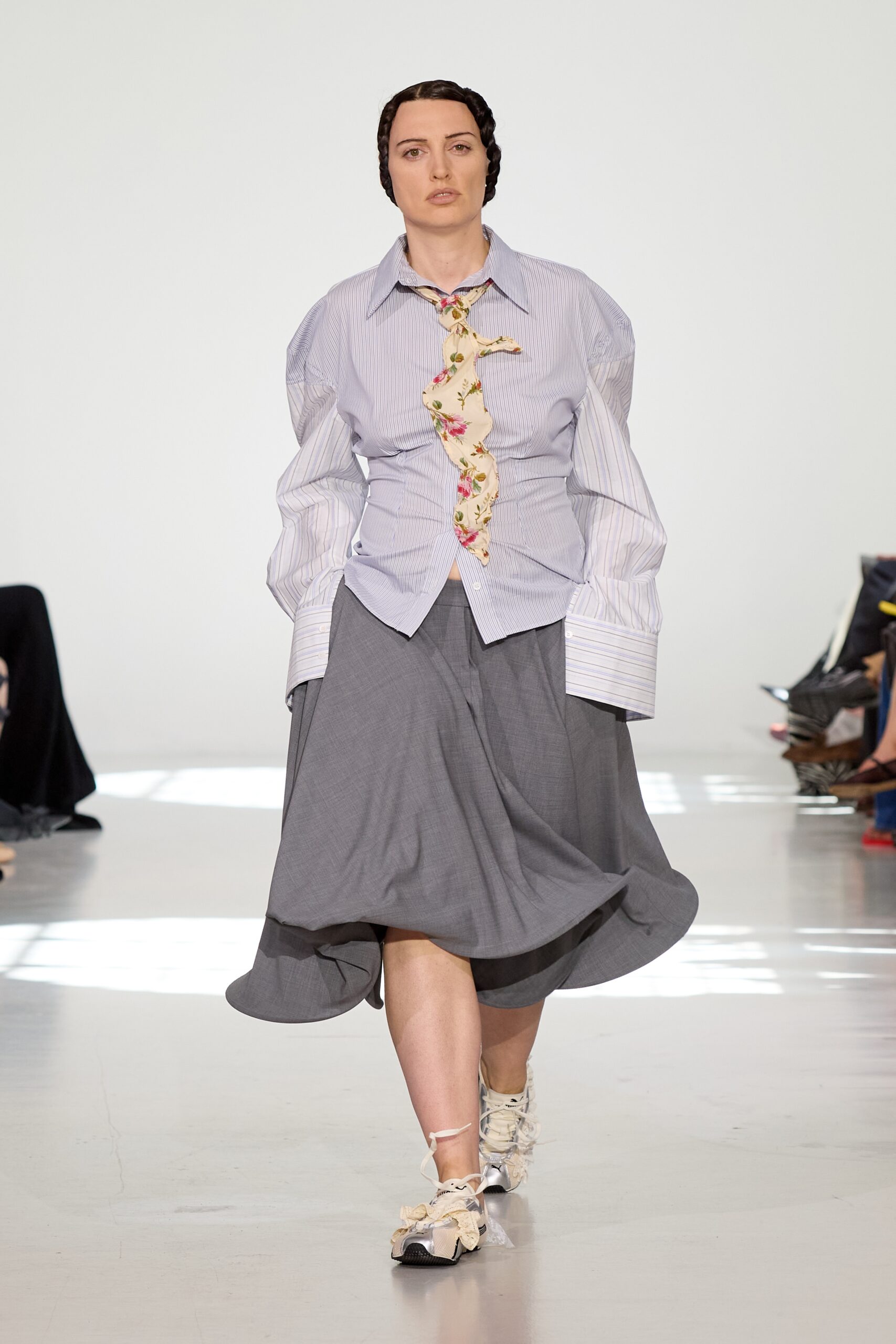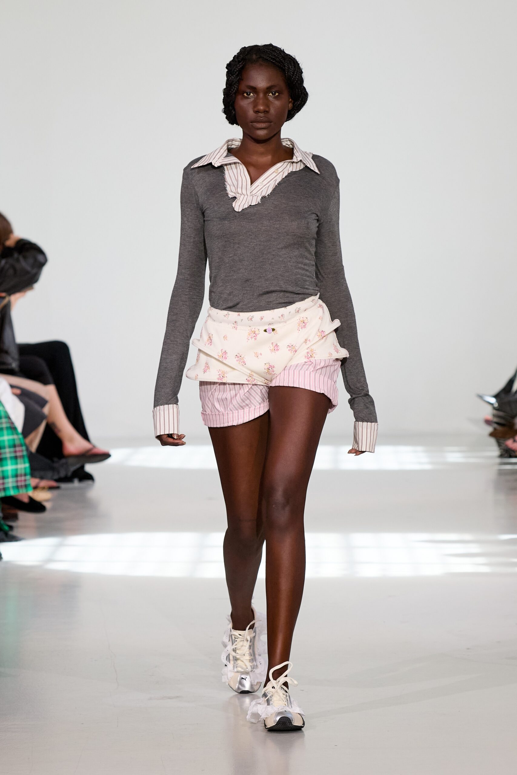 Deadstock fabrics and vintage home textiles are reworked with signature Rave Rvw flair: wrinkled checks, floral ribbed cotton, sheer voiles, gingham, and heat-pressed bed linens reborn as structured suiting. A standout? A pink floral blazer with a matching pencil skirt, sharp in shape but tender in tone — ceremonial, yet completely wearable.