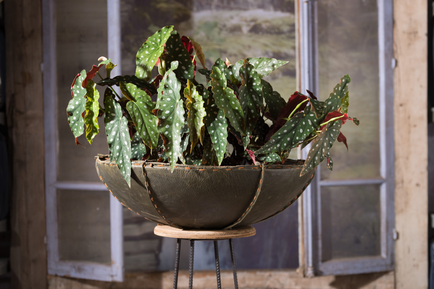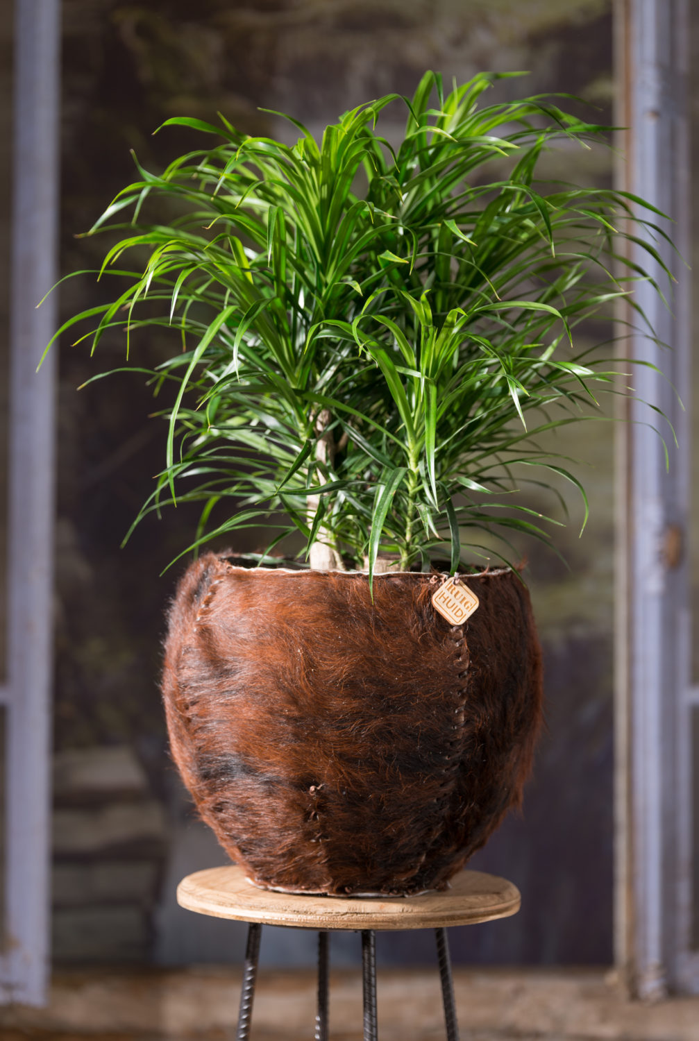 Some time ago, Liesbeth was employed as a consultant to a leather tanning company in the Netherlands. During her time there she was exposed to different treatments and processes used to produce beautiful pieces of leather. Since she didn’t want to invest in a leather stitching machine, the decision was to make an entirely hand-made product. The resulting item was a small, hand-crafted bag that would hold a plant. Liesbeth experimented with various types of leather and even more designs to understand the possibilities of the material. These bags then developed in size from XS (15 cm high) all the way up to XL (140 cm high) and in more sizes and shapes than you can imagine. To create a new product for a plant pot is challenging, but also rewarding. Still, Liesbeth continues to only use her own hands and no machinery during the design and manufacture of these vases.